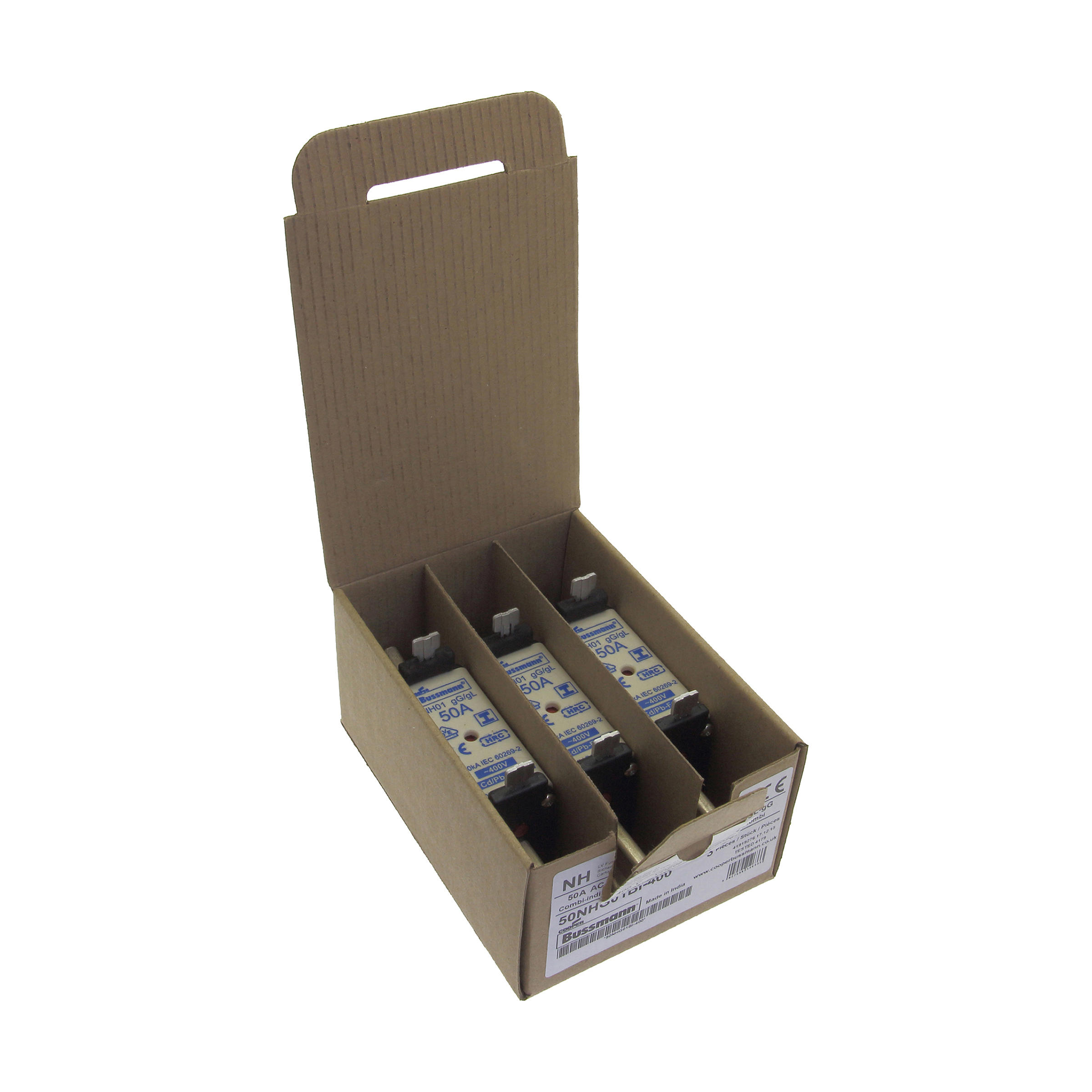 zekering, zekeringelement, Lage spanning, 50 A, AC 400 V, NH01, gL/gG, IEC, dubbel (combinatie-) meldersysteem, vierkant huis met mescontacten, geïsoleerde grepen, IEC 60269-2 zekeringsysteem A, DIN 43620, VDE 0636-2. Uitschakelvermogen 120 kA