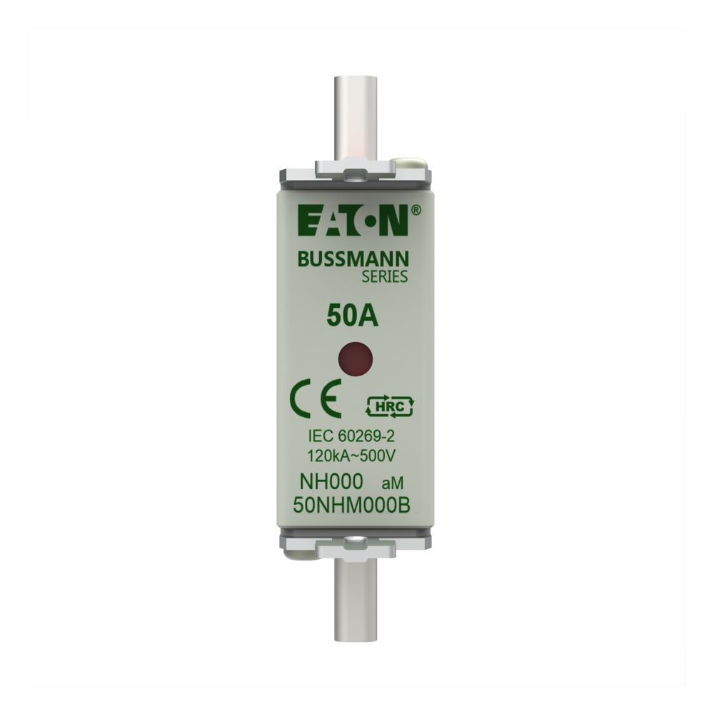 Bezpiecznik, Wkładka bezpiecznikowa, Niskie napięcie, 50 A, AC 500 V, NH000, aM, IEC, sygnalizator podwójny, korpus kwadratowy ze stykami nożowymi, ruchome uchwyty, IEC 60269-2 układ bezpiecznikowy A, DIN 43620, VDE 0636-2, Zdolność wyłączania 120 kA