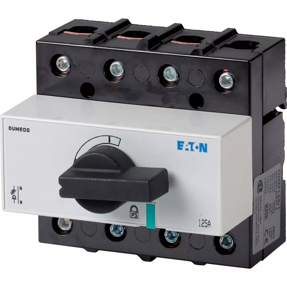 Rozłącznik izolacyjny, Zacisk śrubowy: Rozłącznik izolacyjny, Wyłącznik główny, wyłącznik serwisowy, Odniesienie grupy części DMM, Z czarnym uchwytem obrotowym i osią napędu, Uwagi: widoczne styki, Informacje dotyczące dostarczonego sprzętu: styk pomocniczy montowany przez użytkownika., z wyposażeniem do przyłączania, 3-biegunowy, Stopień ochrony: IP20, Projekt: montaż powierzchniowy, Moc znamionowa AC-23A, 50 - 60 Hz 400 V: P = 59 kW, Znamionowy prąd ciągły: Iu = 125 A, Normy: IEC/EN 60947, VDE 0660, IEC/EN 60204, Rozłącznik izolacyjny zgodnie z normą IEC/EN 60947-3