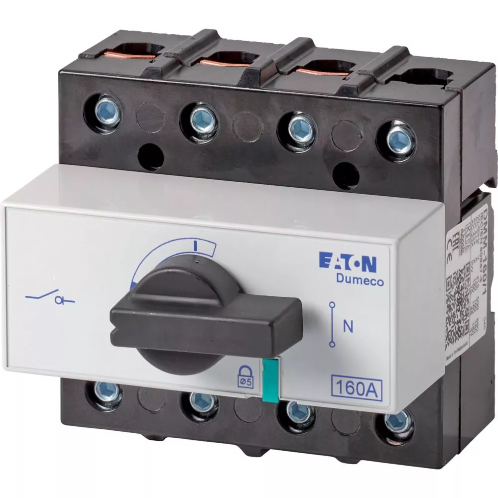 Rozłącznik izolacyjny, Zacisk śrubowy: Rozłącznik izolacyjny, Wyłącznik główny, wyłącznik serwisowy, Odniesienie grupy części DMM, Z czarnym uchwytem obrotowym i osią napędu, Uwagi: widoczne styki, Informacje dotyczące dostarczonego sprzętu: styk pomocniczy montowany przez użytkownika., z wyposażeniem do przyłączania, 3-biegunowy + SN (bezpośredni), Stopień ochrony: IP20, Projekt: montaż powierzchniowy, Moc znamionowa AC-23A, 50 - 60 Hz 400 V: P = 80 kW, Znamionowy prąd ciągły: Iu = 160 A, Normy: IEC/EN 60947, VDE 0660, IEC/EN 60204, Rozłącznik izolacyjny zgodnie z normą IEC/EN 60947-3