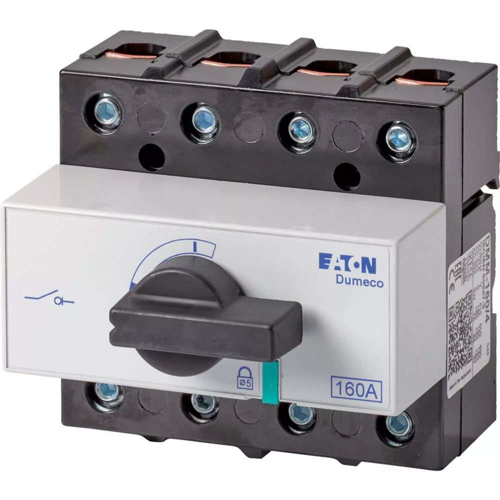 Rozłącznik izolacyjny, Zacisk śrubowy: Rozłącznik izolacyjny, Wyłącznik główny, wyłącznik serwisowy, Odniesienie grupy części DMM, Z czarnym uchwytem obrotowym i osią napędu, Uwagi: widoczne styki, Informacje dotyczące dostarczonego sprzętu: styk pomocniczy montowany przez użytkownika., z wyposażeniem do przyłączania, 4-biegunowy, Stopień ochrony: IP20, Projekt: montaż powierzchniowy, Moc znamionowa AC-23A, 50 - 60 Hz 400 V: P = 80 kW, Znamionowy prąd ciągły: Iu = 160 A, Normy: IEC/EN 60947, VDE 0660, IEC/EN 60204, Rozłącznik izolacyjny zgodnie z normą IEC/EN 60947-3