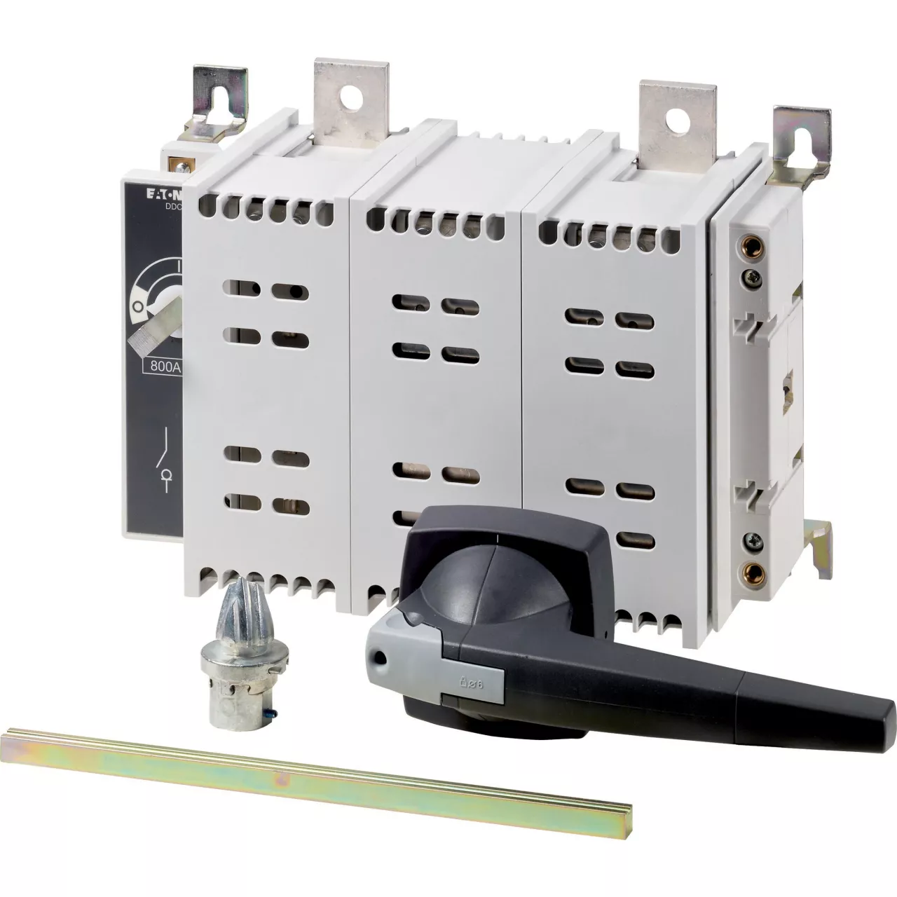 Rozłącznik izolacyjny DC, Zacisk śrubowy: Rozłącznik izolacyjny DC, Wyłącznik główny, wyłącznik serwisowy, Odniesienie grupy części DDC, z szarym pokrętłem, Uwagi: Z metalowym wałkiem do rozdzielnic o głębokości 400 mm, Informacje dotyczące dostarczonego sprzętu: styk pomocniczy montowany przez użytkownika., 2-biegunowy, Stopień ochrony: IP20, Projekt: montaż na panelu tylnym, Znamionowy prąd ciągły: Iu = 800 A, Normy: IEC/EN 60947, VDE 0660, IEC/EN 60204, Rozłącznik izolacyjny zgodnie z normą IEC/EN 60947-3