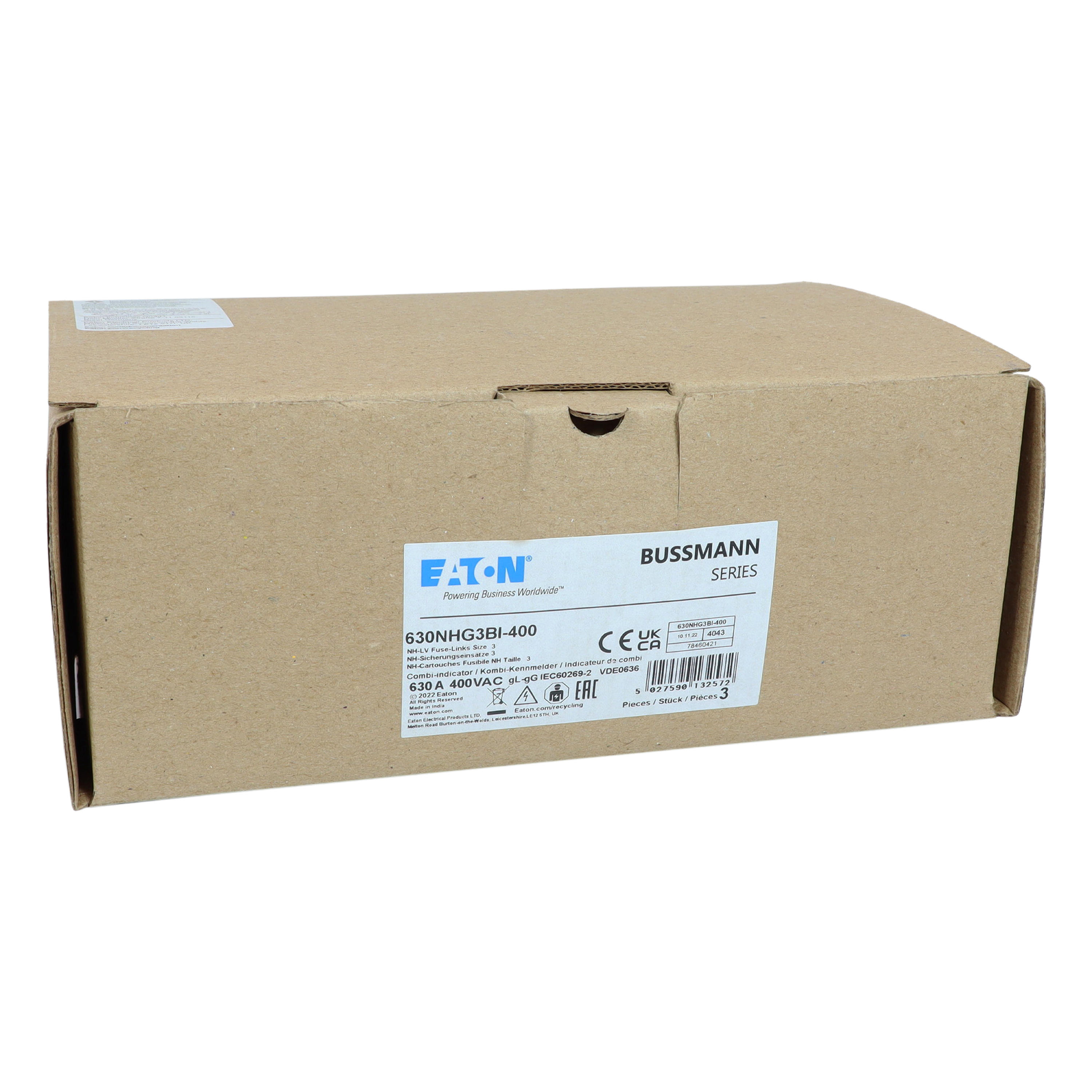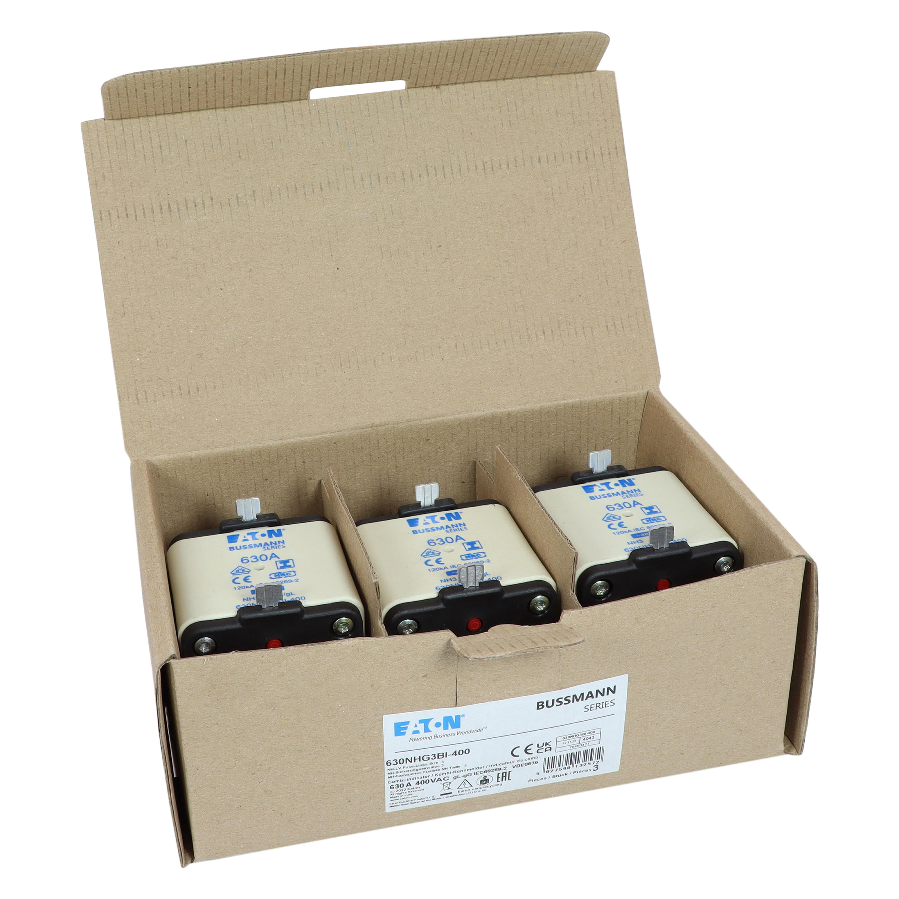 zekering, zekeringelement, Lage spanning, 630 A, AC 400 V, NH3, gL/gG, IEC, dubbel (combinatie-) meldersysteem, vierkant huis met mescontacten, geïsoleerde grepen, IEC 60269-2 zekeringsysteem A, DIN 43620, VDE 0636-2. Uitschakelvermogen 120 kA