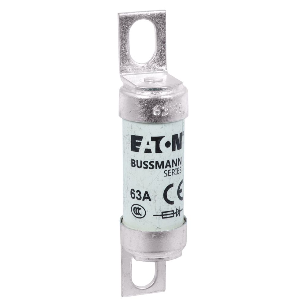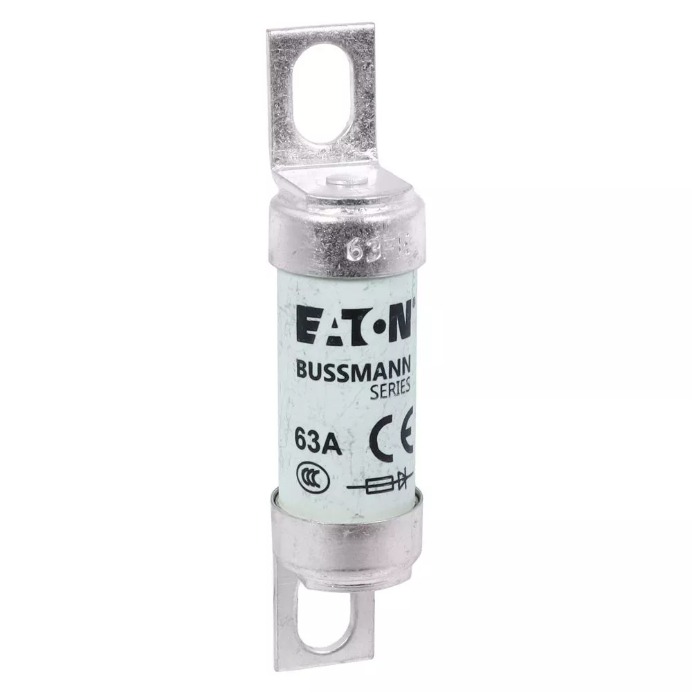 Bezpiecznik, wkładka bezpiecznikowa, szybki, 63 A, 690 V AC, 500 V DC, BS88, 19 x 77 mm, aR, BS, przesunięte przykręcane uchwyty, ochrona wspólnej szyny DC, napędy DC, przekształtniki mocy /prostowniki i rozruszniki o obniżonym napięciu, BS88-4, IEC 60269-4, zdolność wyłączania 200 kA, opcjonalne akcesoria, podstawa bezpiecznikowa BH-0111
