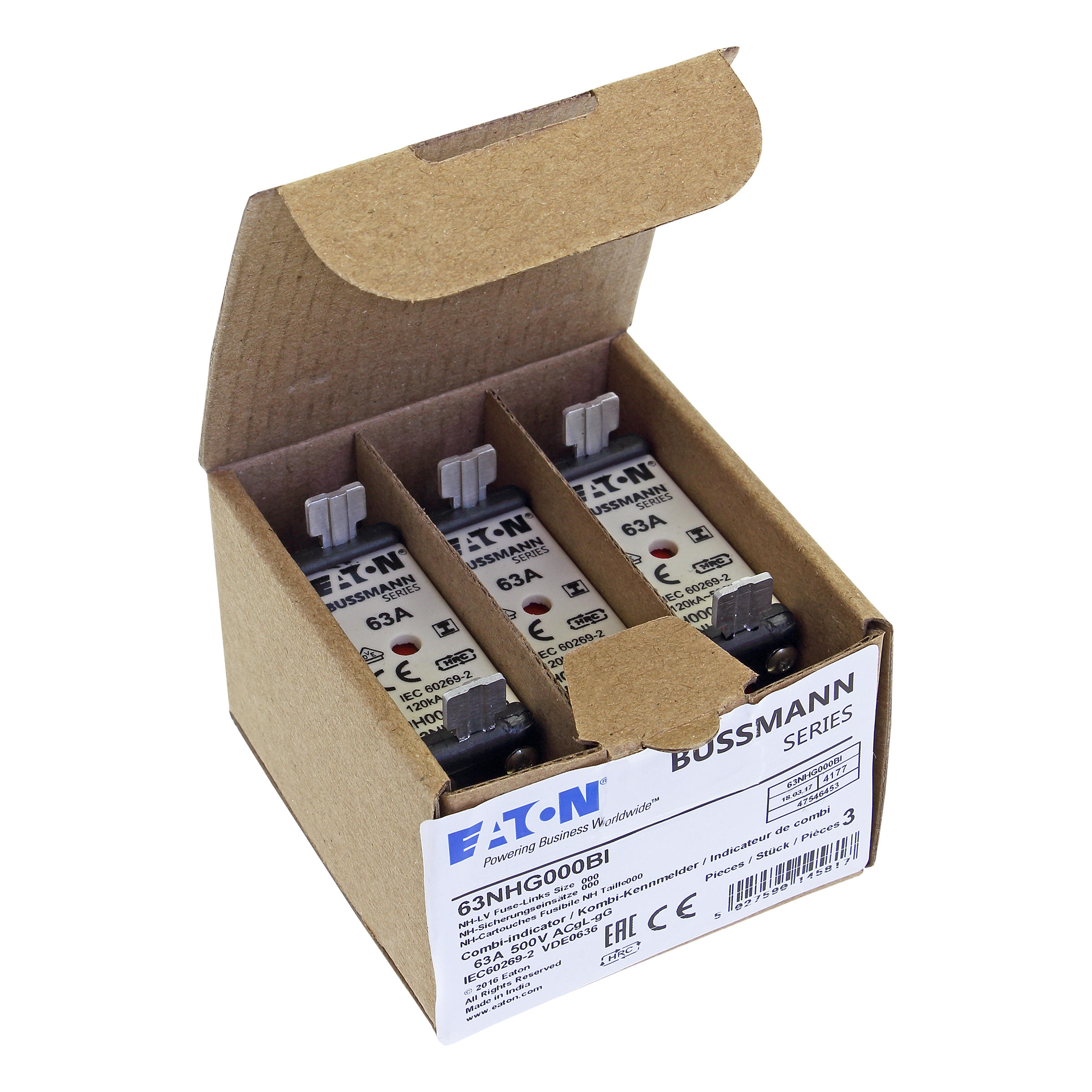 zekering, zekeringelement, Lage spanning, 63 A, AC 500 V, NH000, gL/gG, IEC, dubbel (combinatie-) meldersysteem, vierkant huis met mescontacten, geïsoleerde grepen, IEC 60269-2 zekeringsysteem A, DIN 43620, VDE 0636-2, uitschakelvermogen 120 kA