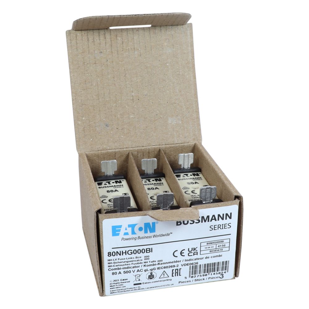 zekering, zekeringelement, Lage spanning, 80 A, AC 500 V, NH000, gL/gG, IEC, dubbel (combinatie-) meldersysteem, vierkant huis met mescontacten, geïsoleerde grepen, IEC 60269-2 zekeringsysteem A, DIN 43620, VDE 0636-2, uitschakelvermogen 120 kA