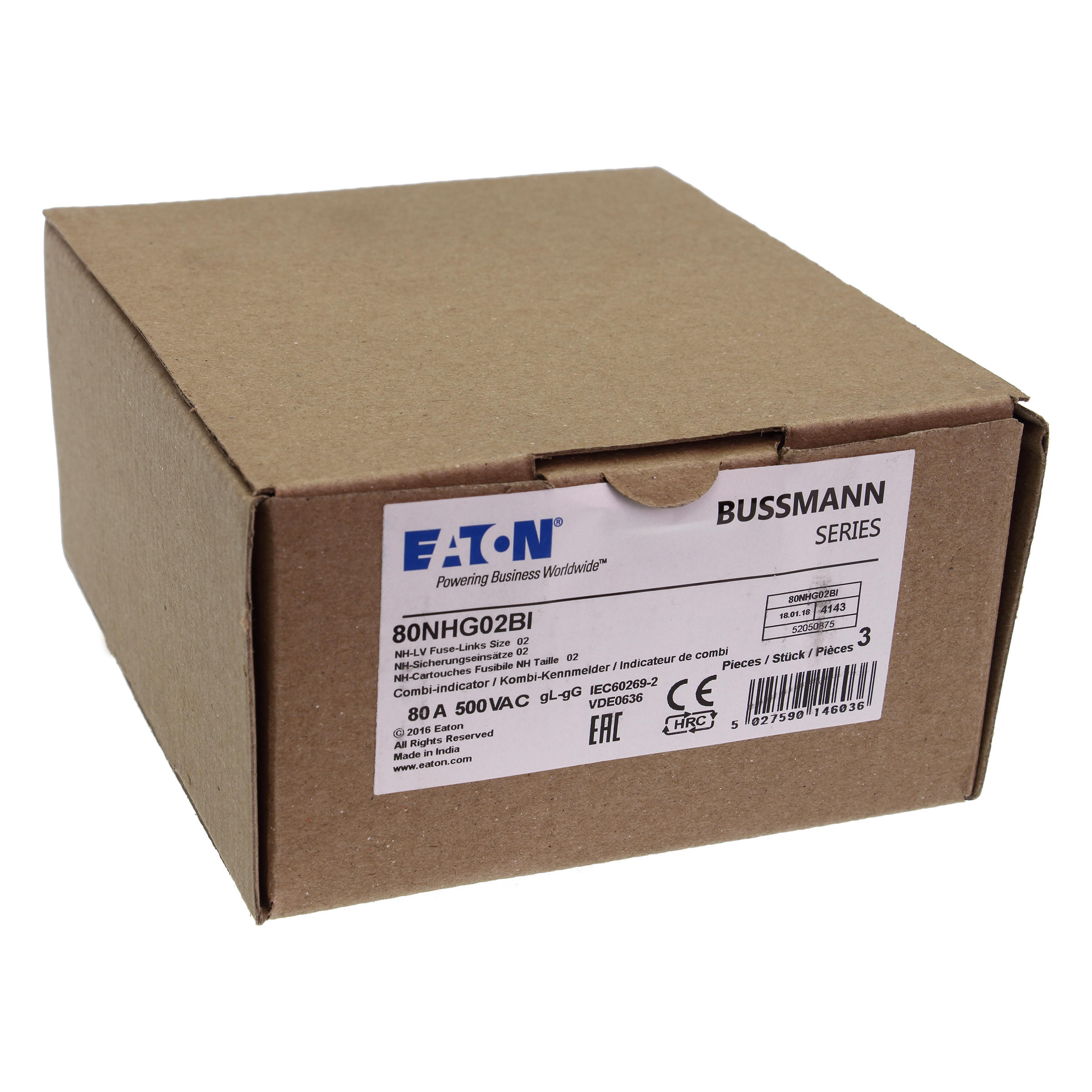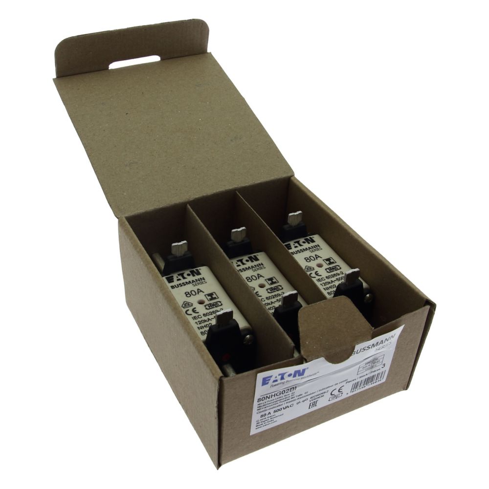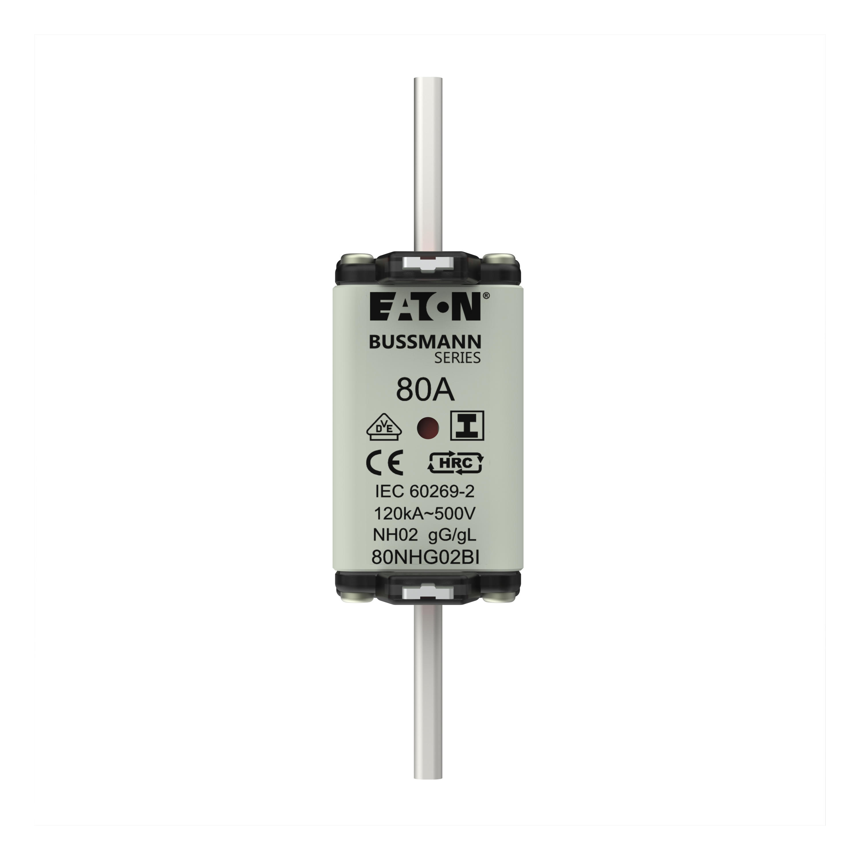 zekering, zekeringelement, Lage spanning, 80 A, AC 500 V, NH02, gL/gG, IEC, dubbel (combinatie-) meldersysteem, vierkant huis met mescontacten, geïsoleerde grepen, IEC 60269-2 zekeringsysteem A, DIN 43620, VDE 0636-2, uitschakelvermogen 120 kA