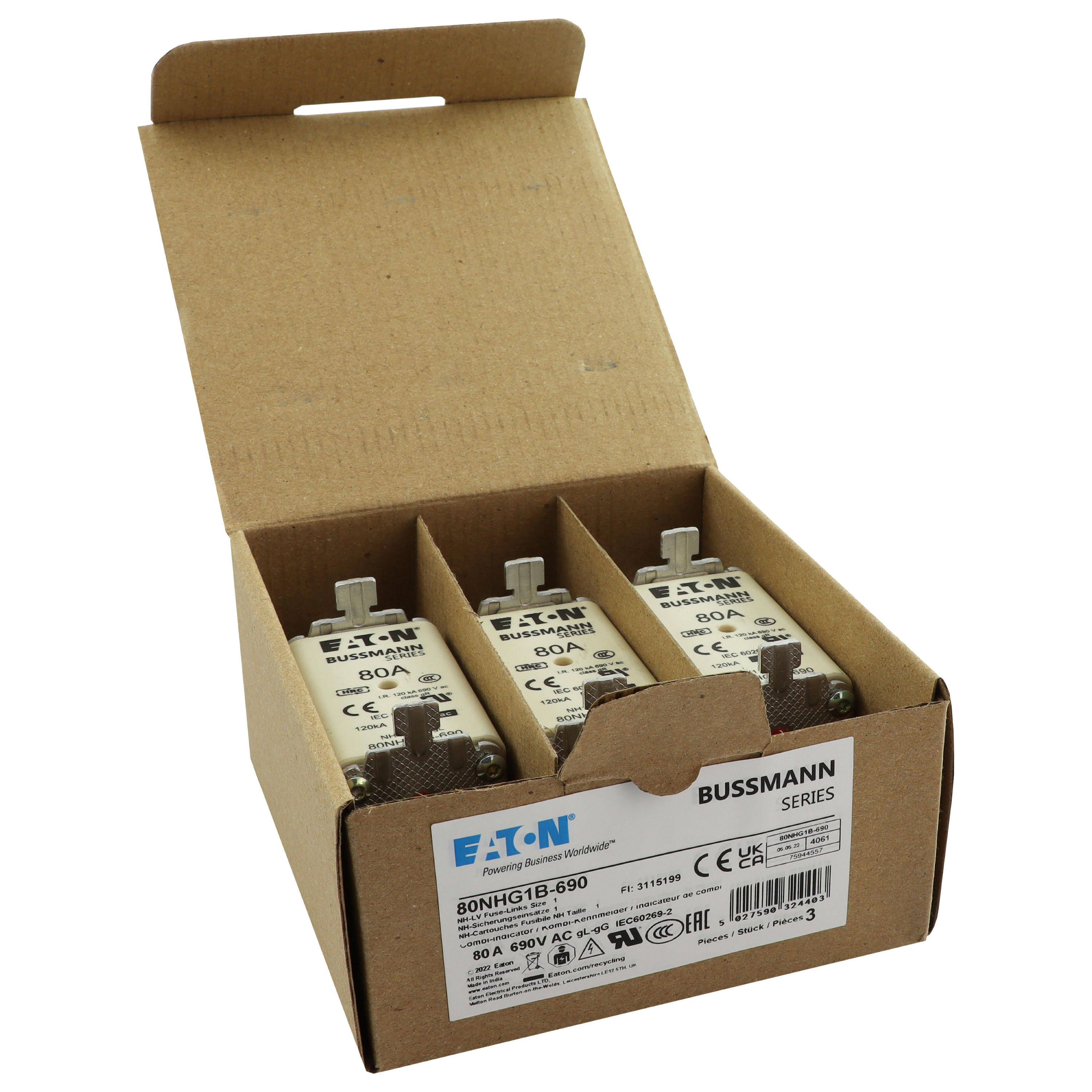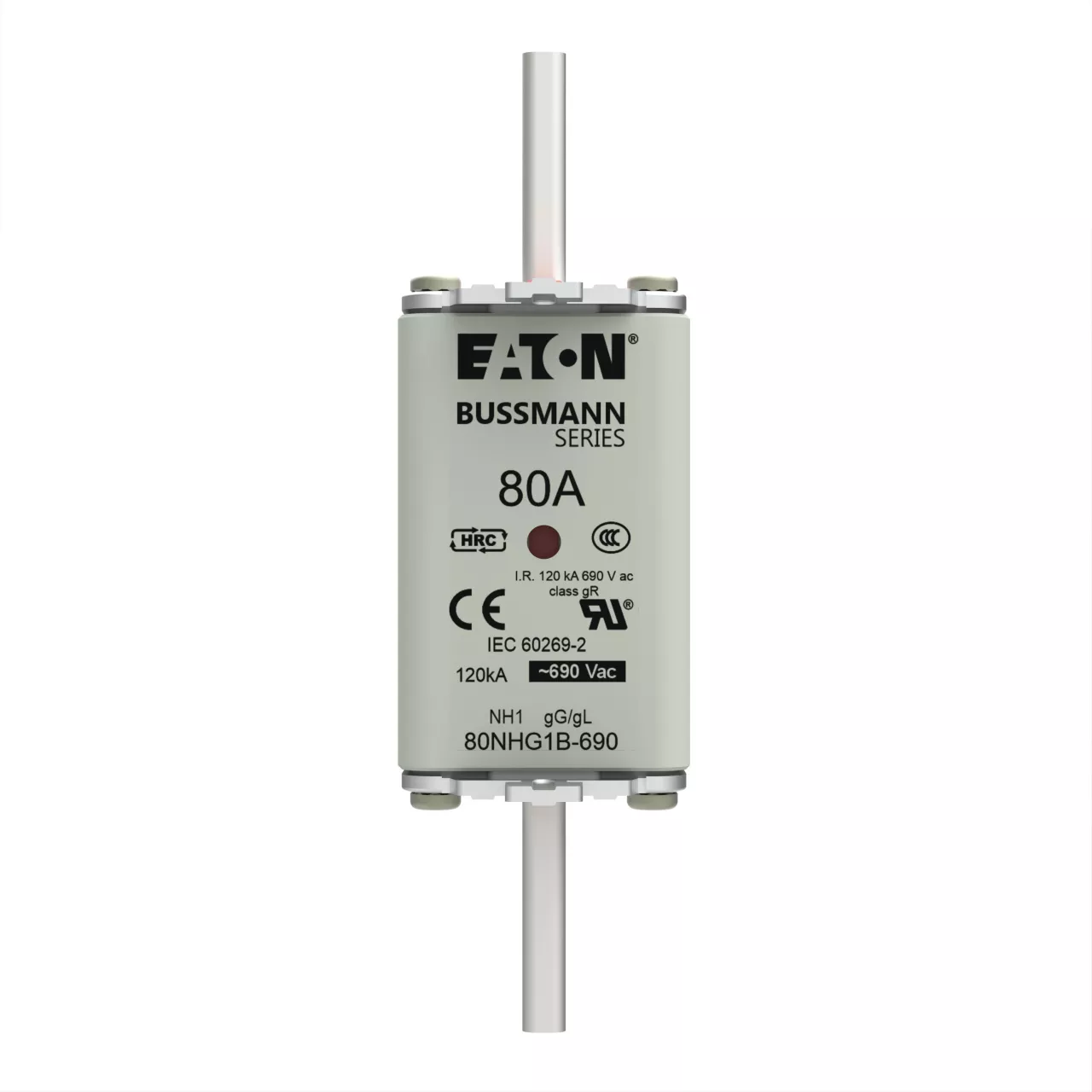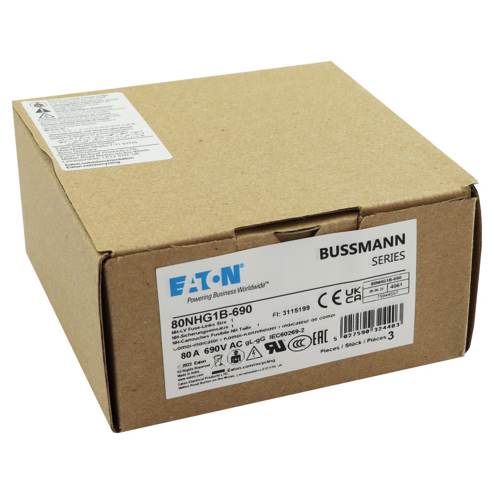 zekering, zekeringelement, Lage spanning, 80 A, AC 690 V, NH1, gL/gG, IEC, dubbel (combinatie-) meldersysteem, vierkant huis met mescontacten, onder spanning staande grepen, IEC 60269-2 zekeringsysteem A, DIN 43620, VDE 0636-2. Uitschakelvermogen 120 kA