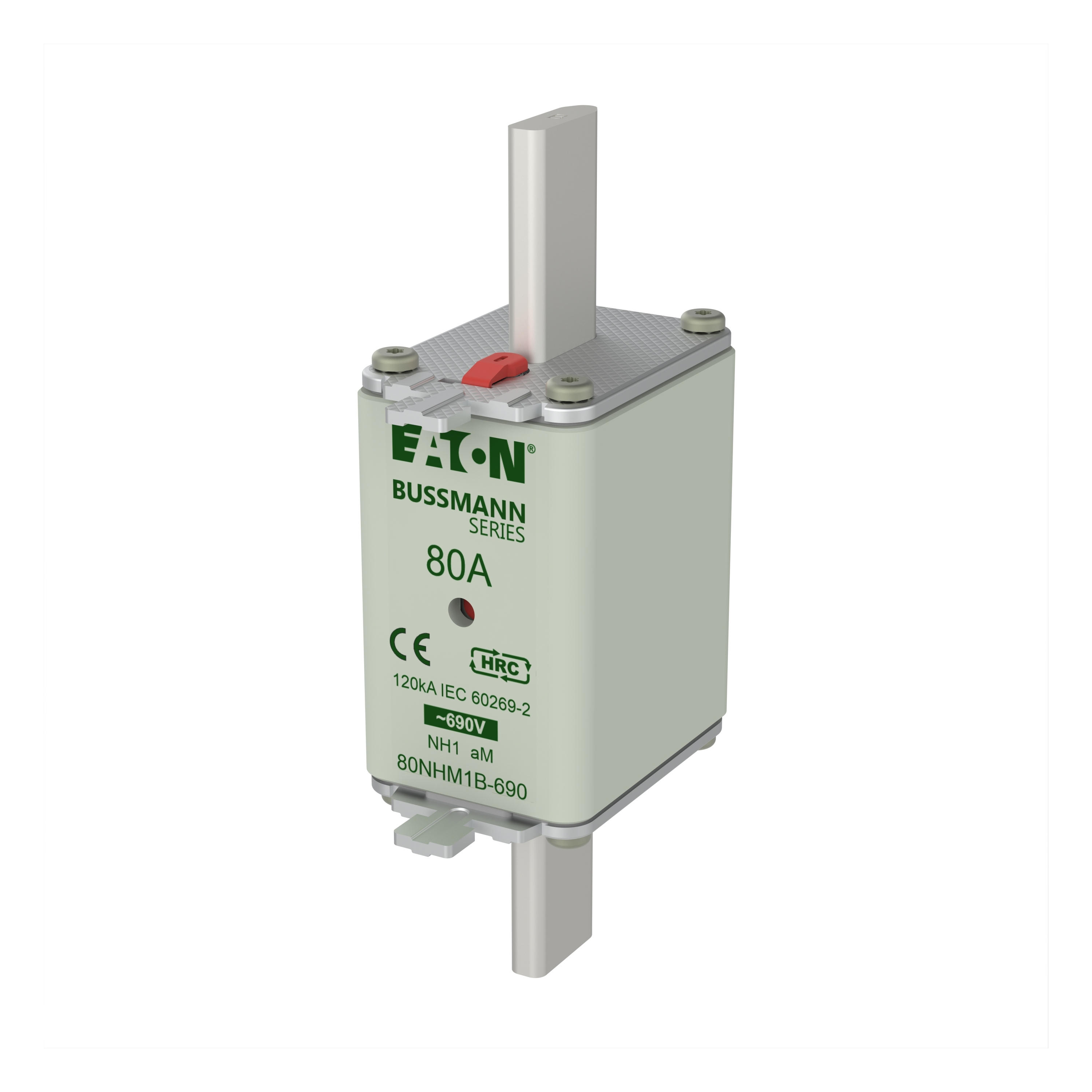 Bezpiecznik, wkładka bezpiecznikowa, niskie napięcie, 80 A, AC 690 V, NH1, aM, IEC, Układ podwójnego sygnalizatora (kombinacja), korpus kwadratowy ze stykami nożowymi, ruchome uchwyty, IEC 60269-2 układ bezpiecznikowy A, DIN 43620, VDE 0636-2. Zdolność wyłączania 120 kA