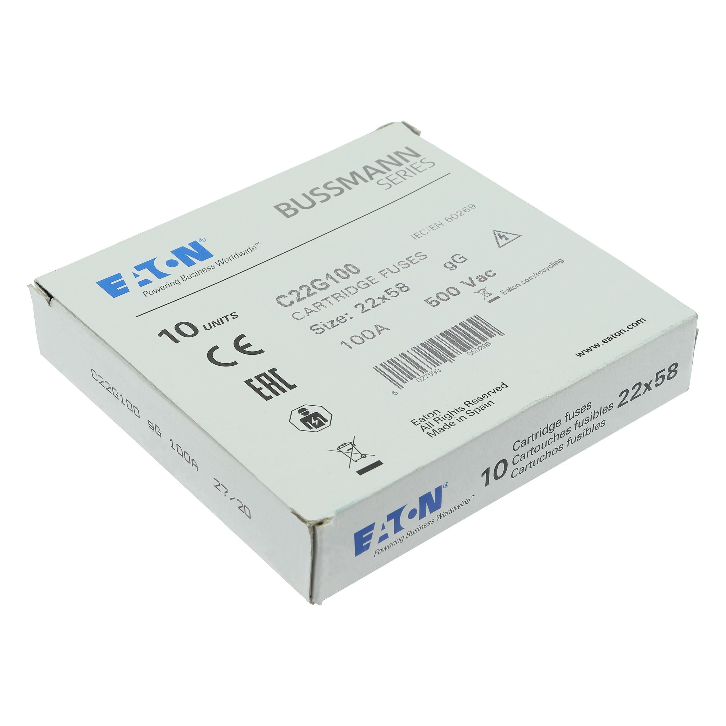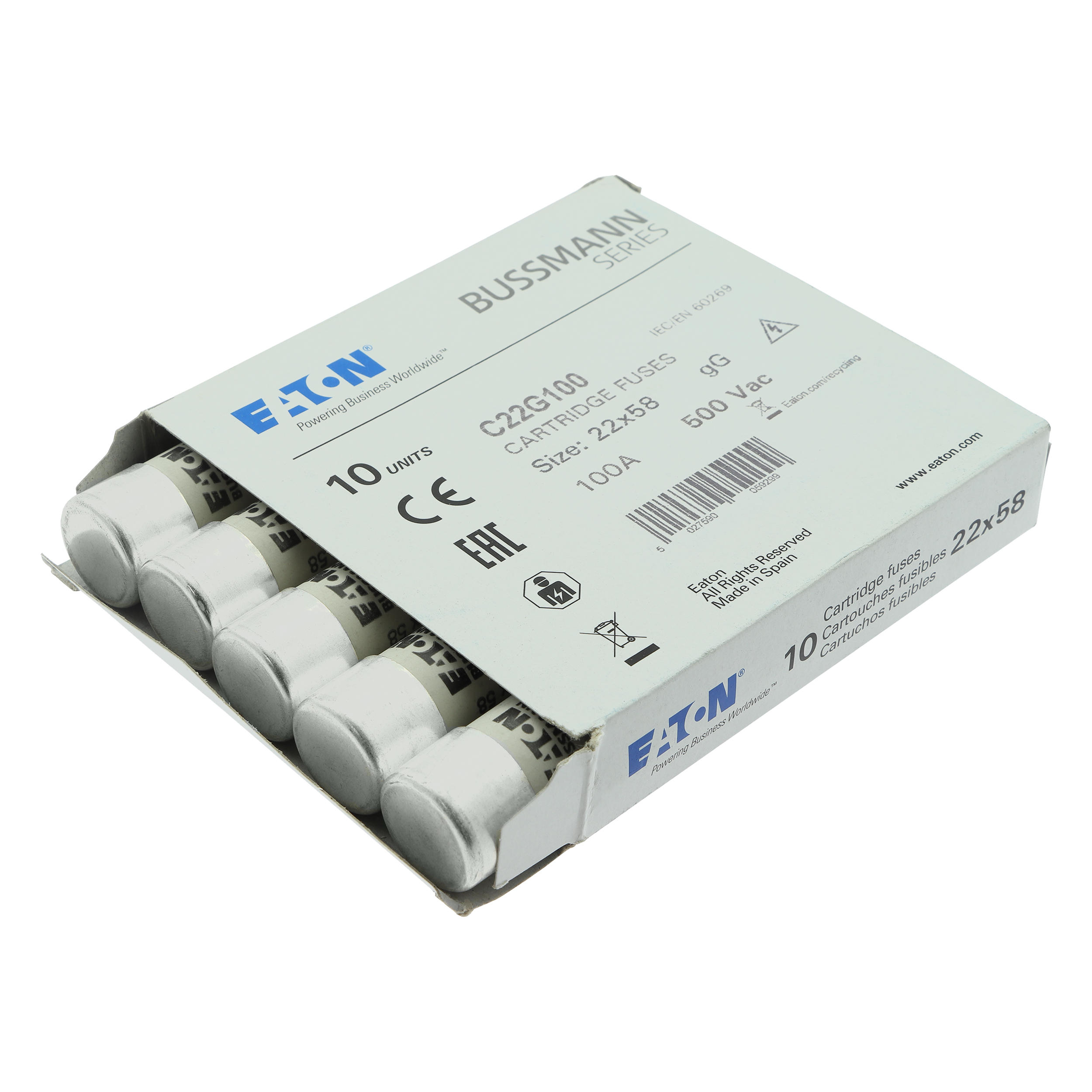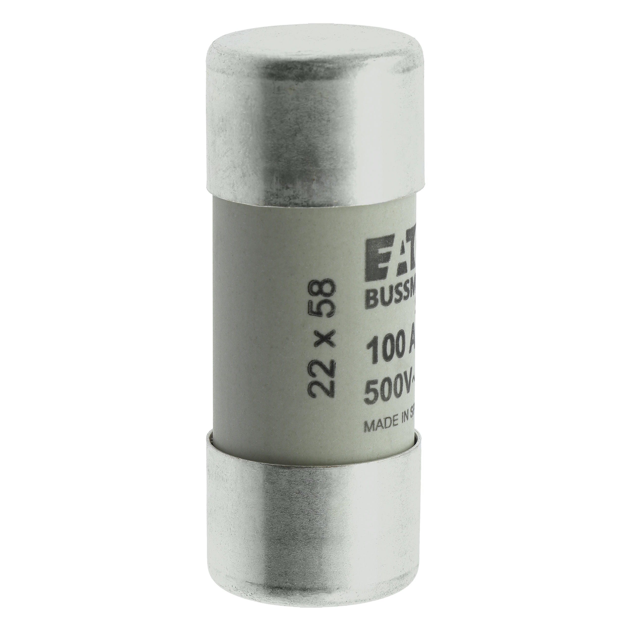 zekering, zekeringelement, laagspanning, 100 A, AC 500 V, 22 x 58 mm, gL/gG, IEC, cilindrisch, voor industriële toepassingen, voor algemeen gebruik, IEC 60269-2