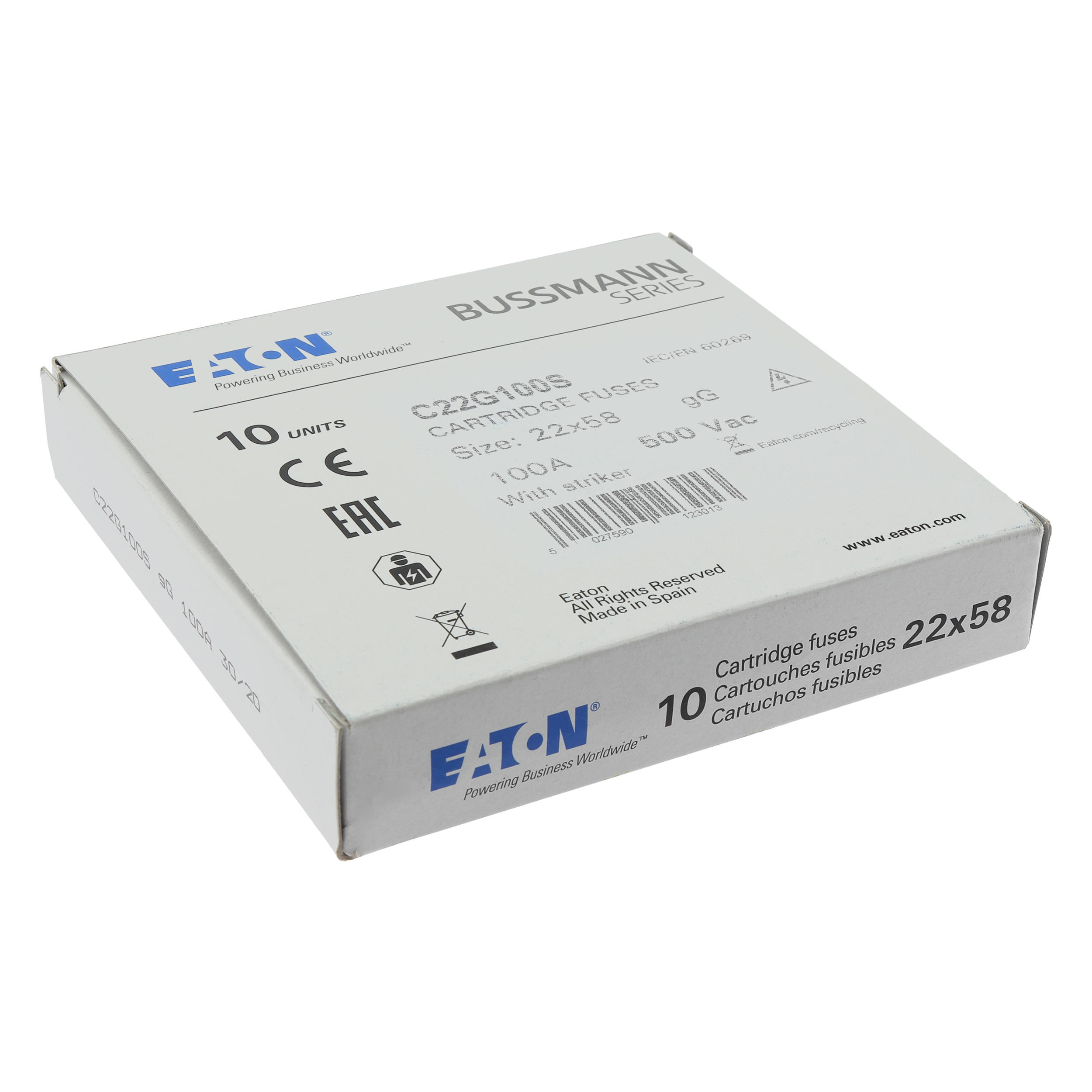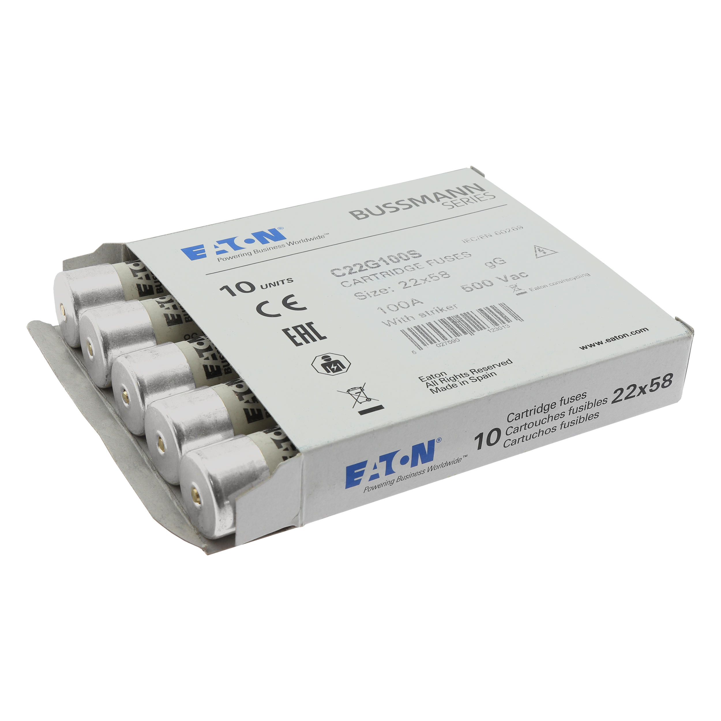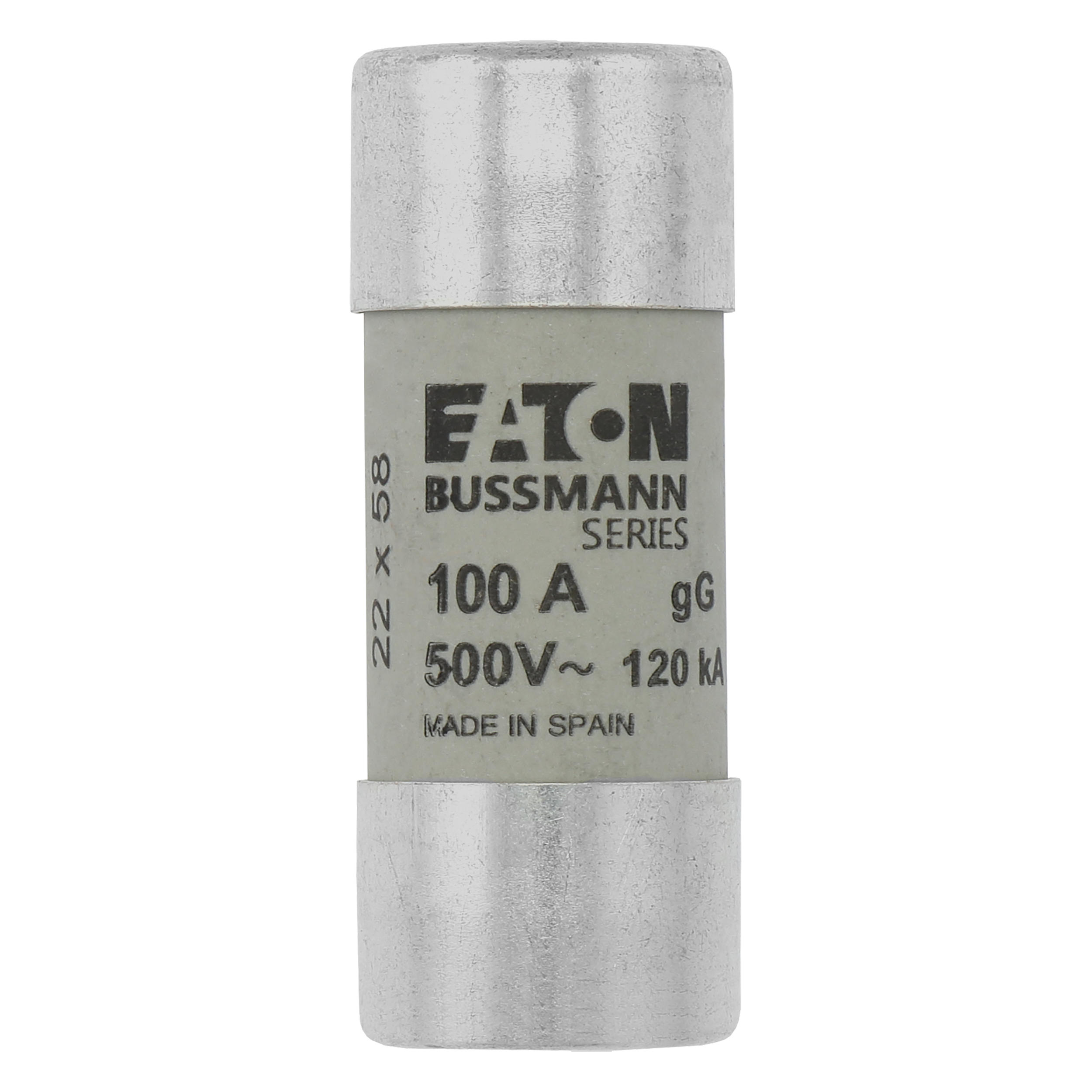 zekering, zekeringelement, laagspanning, 100 A, AC 500 V, 22 x 58 mm, gL/gG, IEC, met slagpin, cilindrisch, IEC 60269-2, afschakelvermogen 120 kA