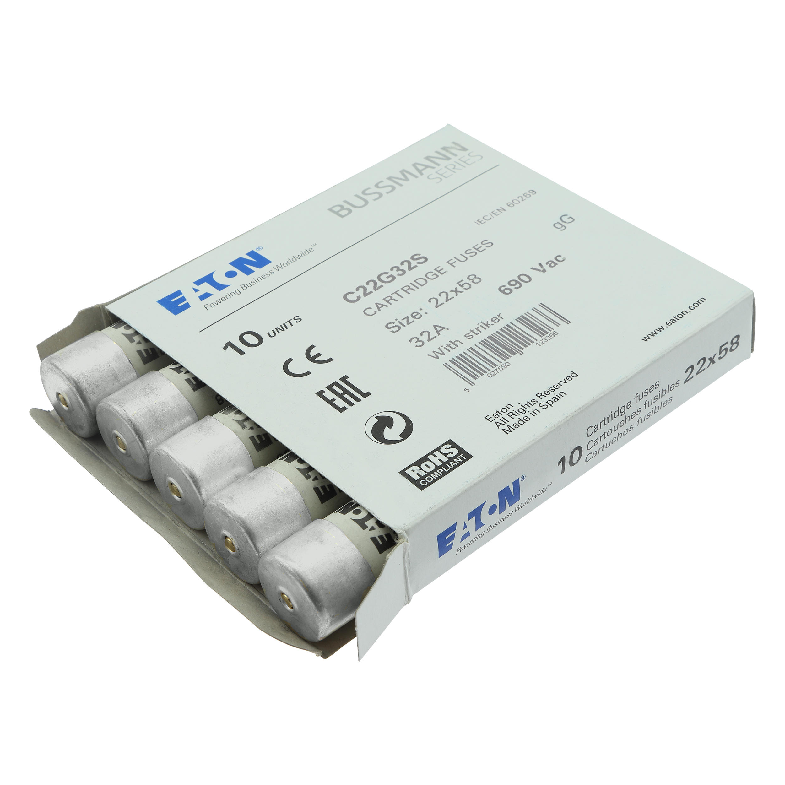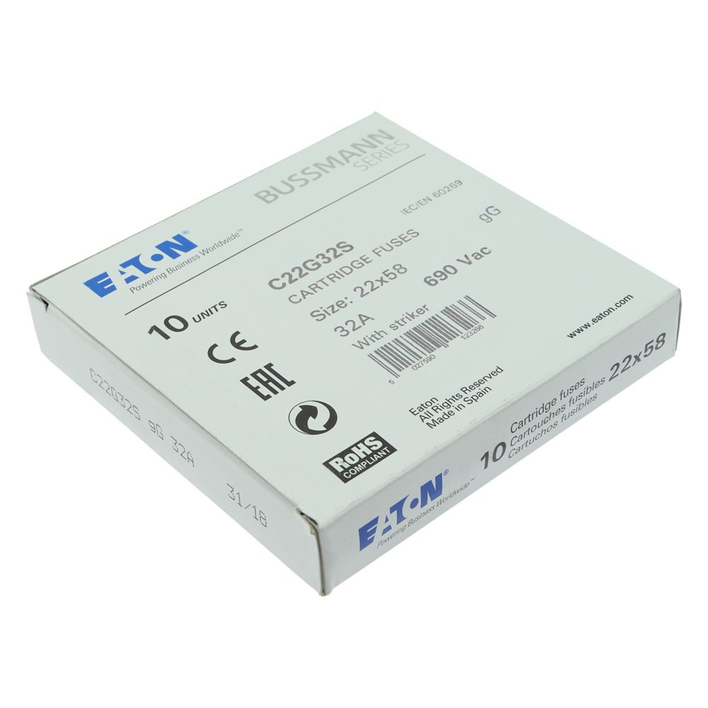 zekering, zekeringelement, laagspanning, 32 A, AC 690 V, 22 x 58 mm, gL/gG, IEC, met slagpin, cilindrisch, IEC 60269-2, afschakelvermogen 80 kA