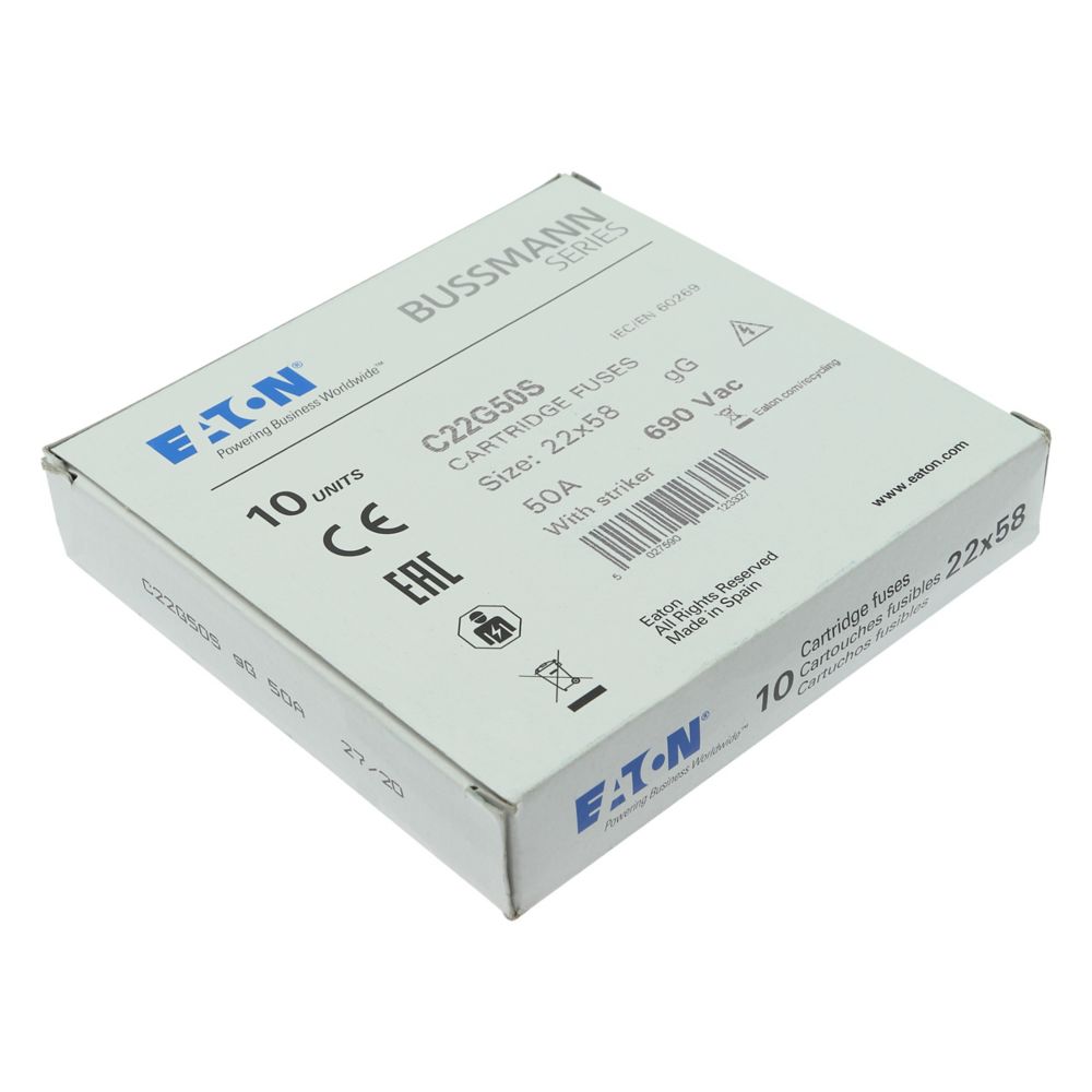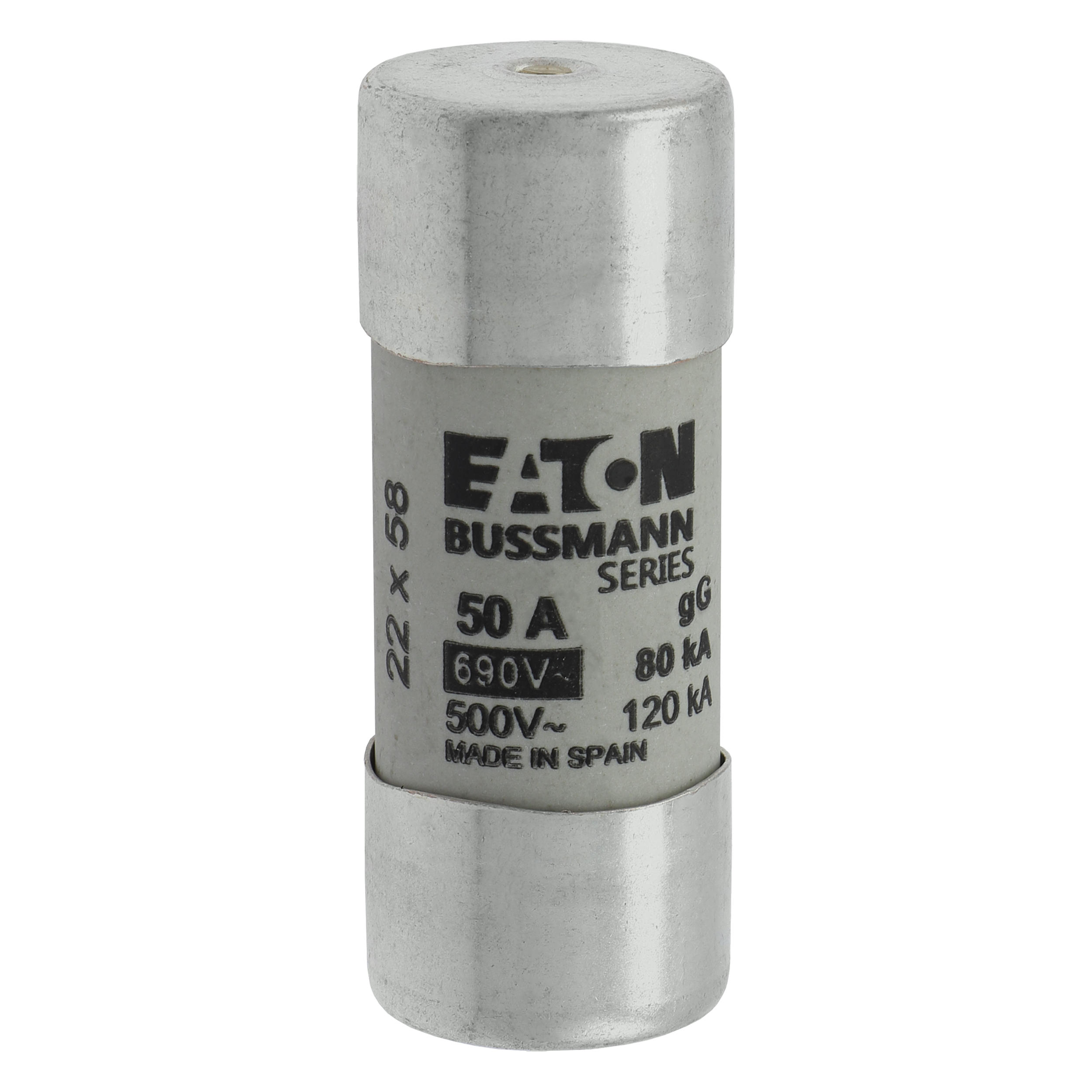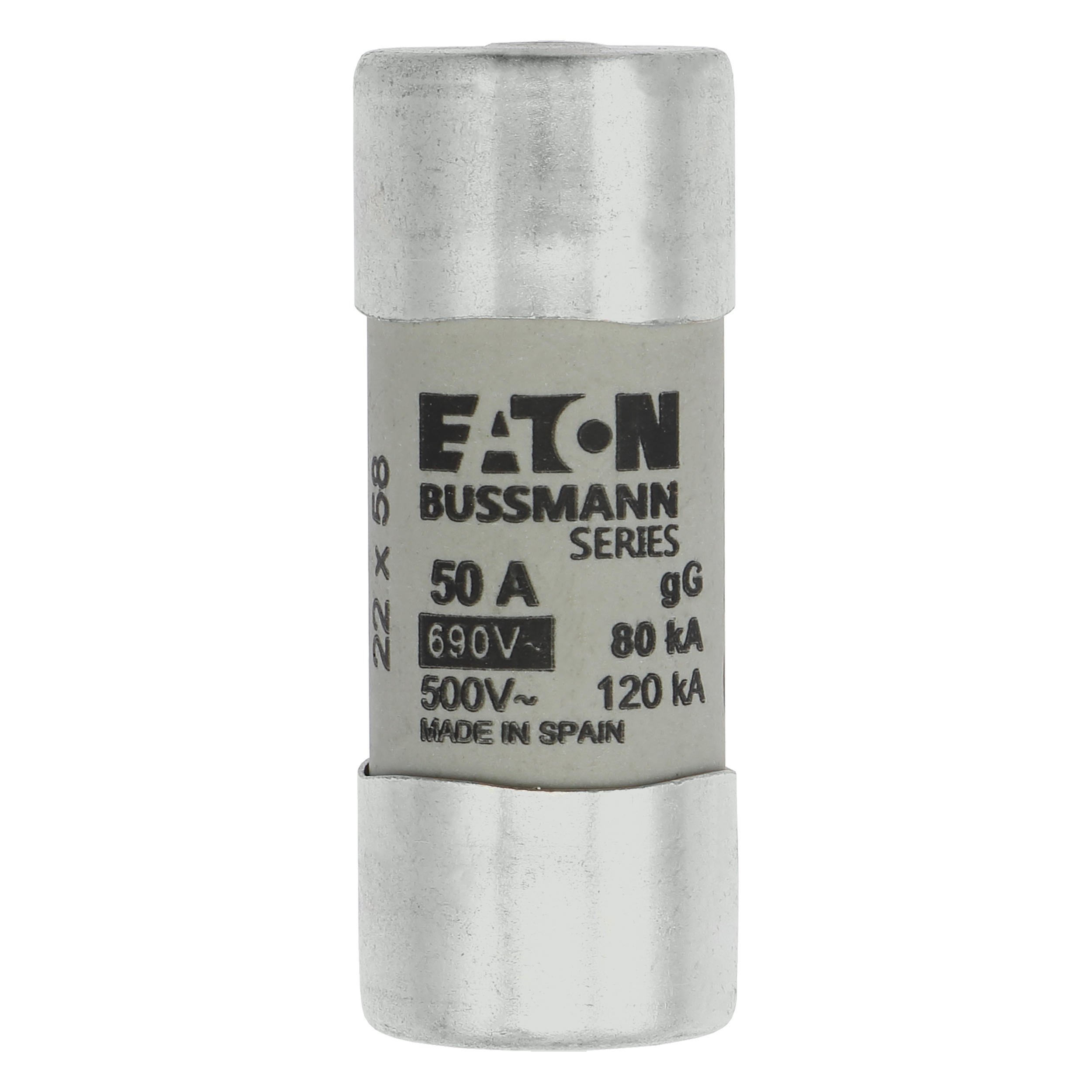 zekering, zekeringelement, laagspanning, 50 A, AC 690 V, 22 x 58 mm, gL/gG, IEC, met slagpin, cilindrisch, IEC 60269-2, afschakelvermogen 80 kA