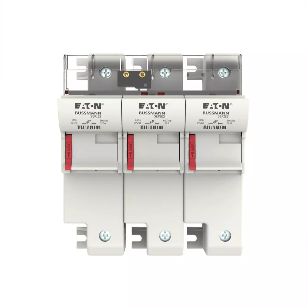 Akcesorium bezpiecznika, uchwyt bezpiecznikowy, niskonapięciowy, 125 A, 690 V AC, 22 x 58 mm, 3P, IEC, UL, z mikroprzełącznikiem, bezpieczniki C22M i C22G, IEC 60269-1, IEC 60269-2, IP20