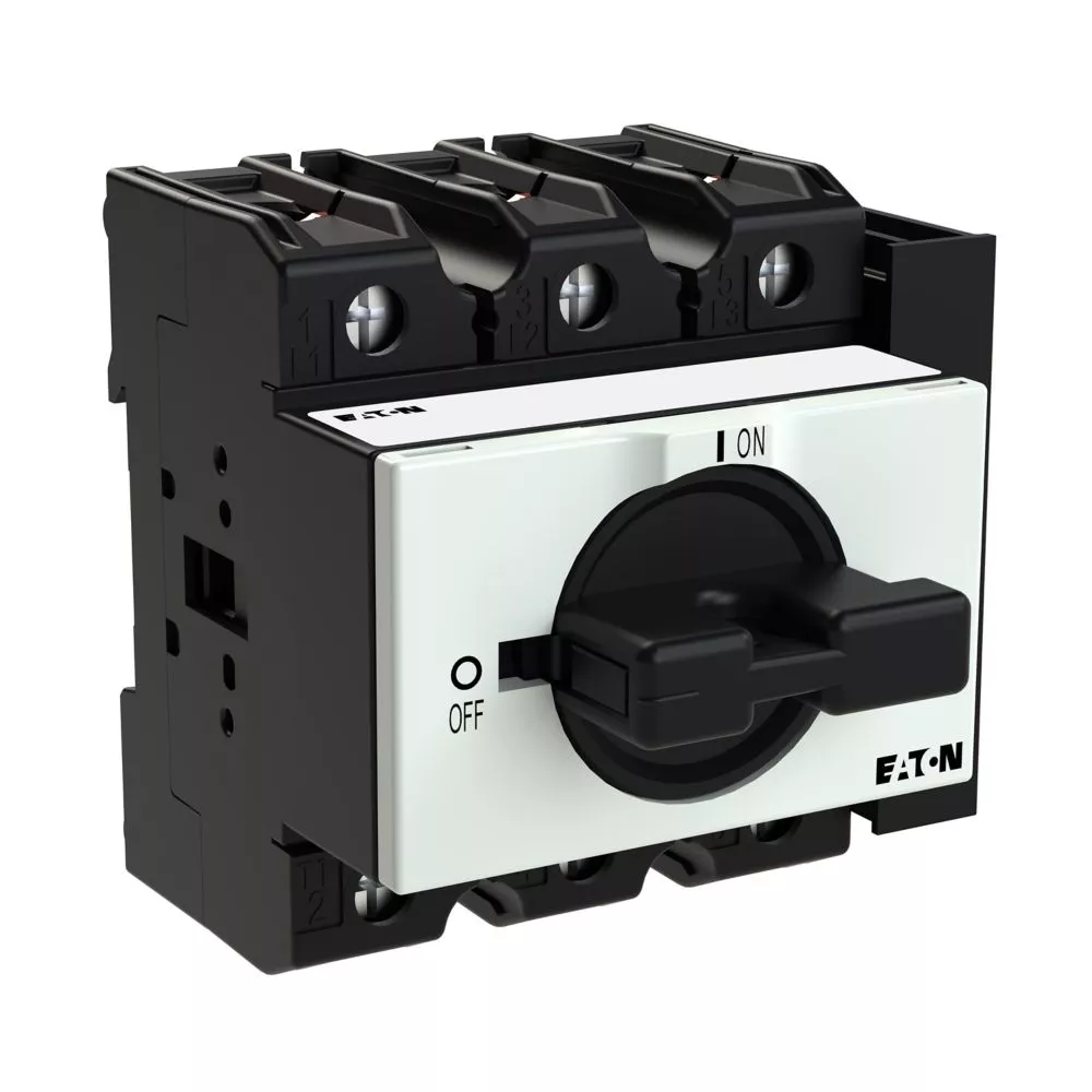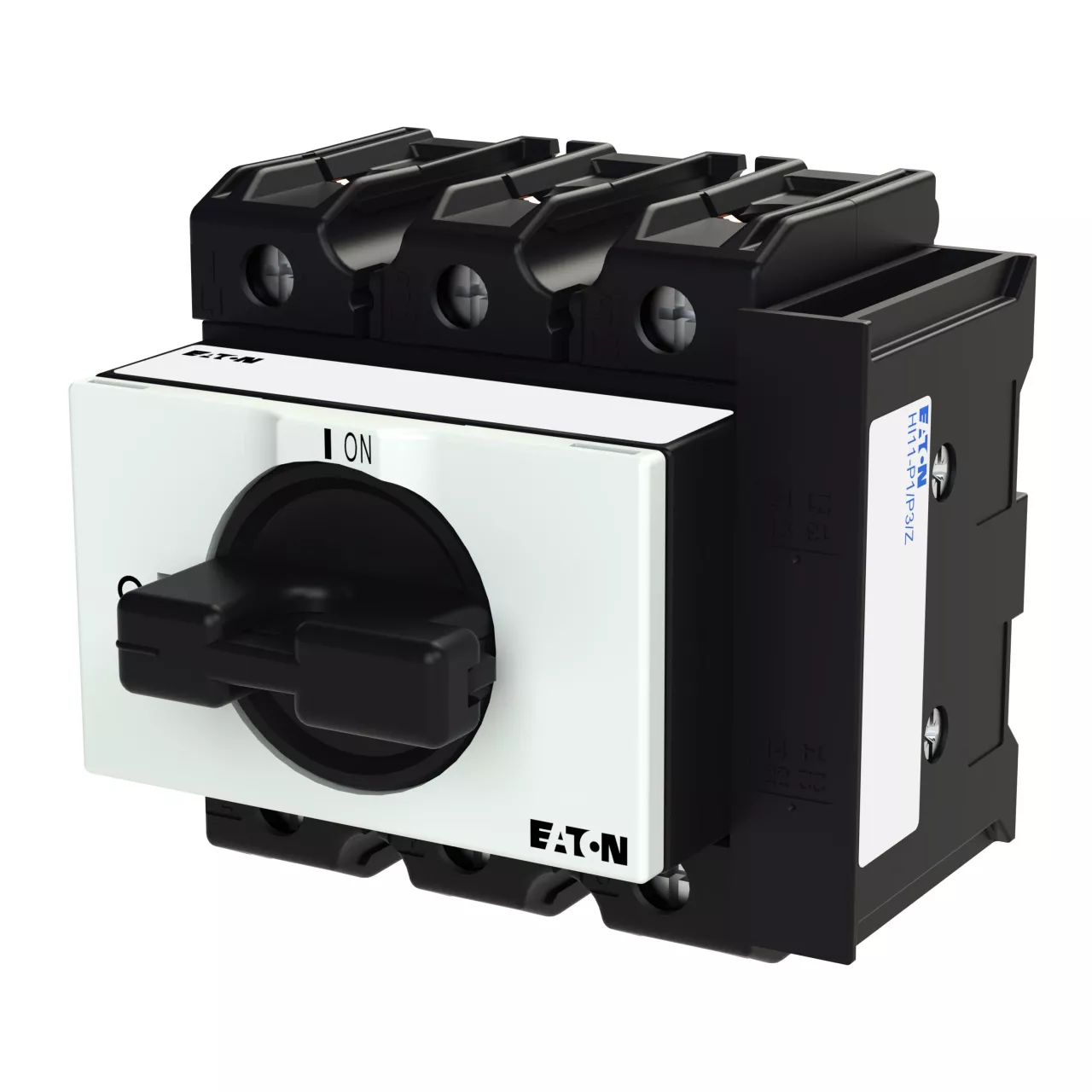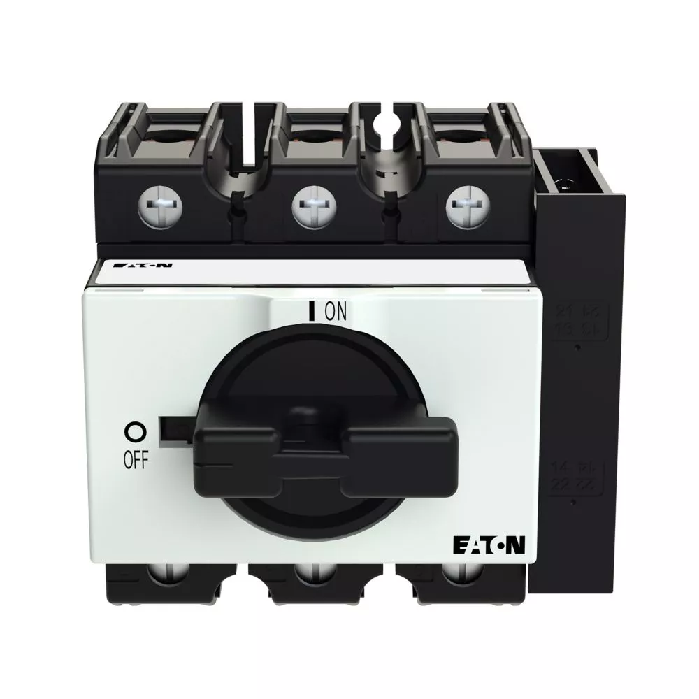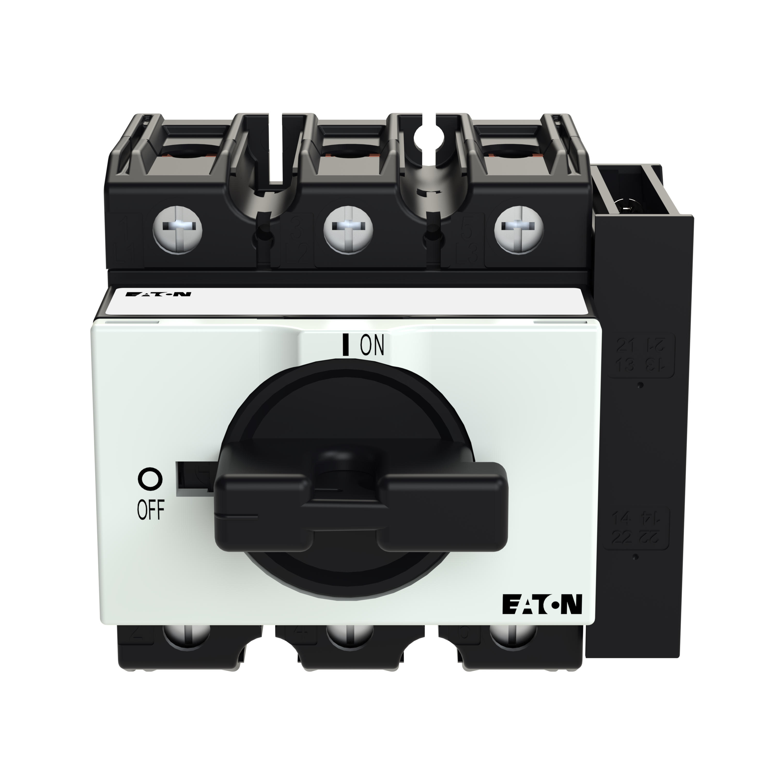 Przełącznik wł.-wył., Zacisk śrubowy: Przełącznik wł.-wył., Odniesienie do grupy części: P3, z czarnym pokrętłem z tabliczką czołową, Informacje dotyczące dostarczonego sprzętu: Styk pomocniczy lub zaciski przewodu neutralnego montowane przez użytkownika., 3-biegunowy, Stopień ochrony: Przód IP30, Wykonanie: Montaż na szynie DIN, Moc znamionowa AC-23A, 50 - 60 Hz 400 V: P = 55 kW, Znamionowy prąd ciągły: Iu = 100 A, Normy: IEC/EN 60947, VDE 0660, IEC/EN 60204, CSA, UL, Rozłącznik izolacyjny zgodnie z normą IEC/EN 60947-3