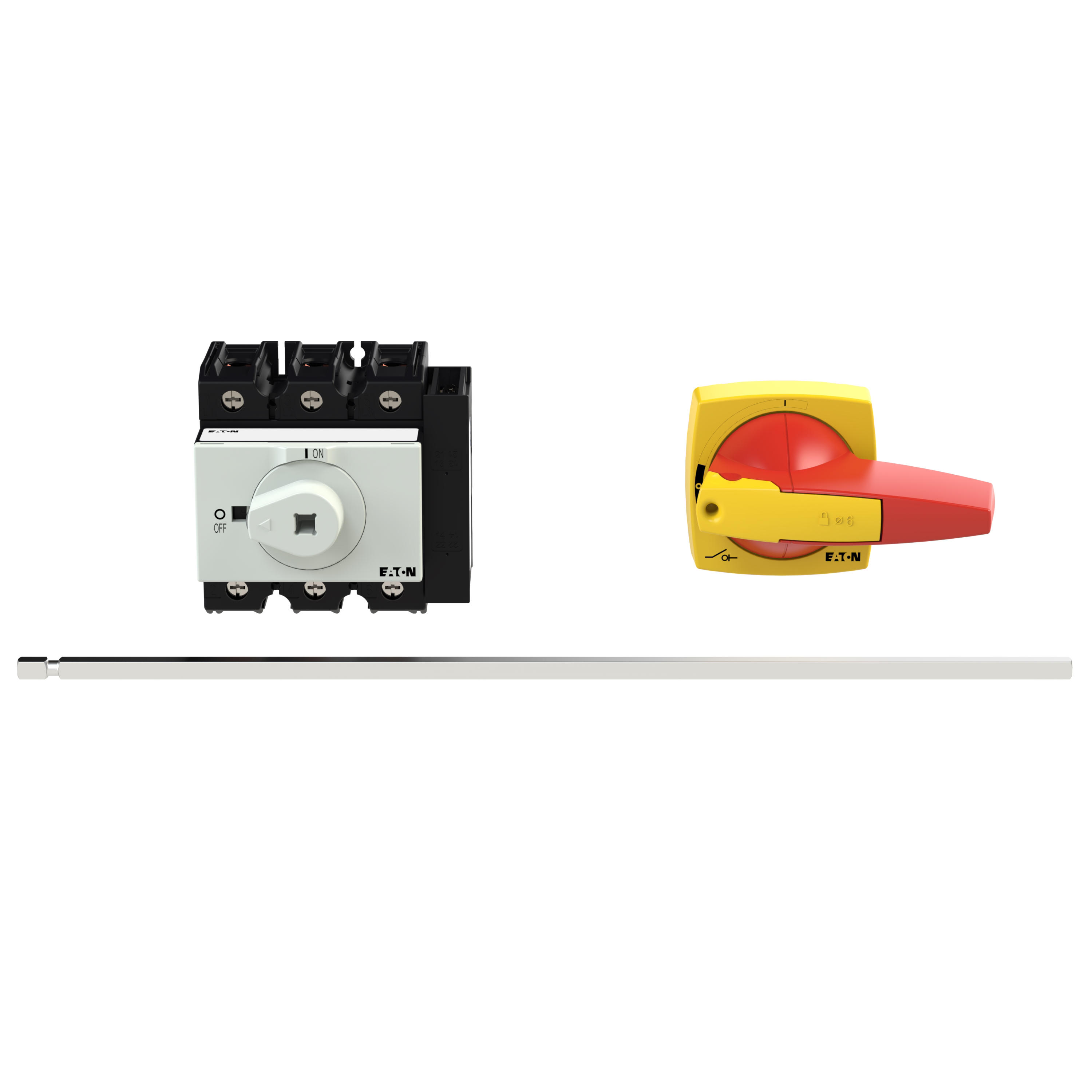 Wyłącznik główny, Zacisk śrubowy: Wyłącznik główny, wyłącznik serwisowy, Odniesienie do grupy części: P3, Funkcja zatrzymania: Funkcja wyłączania awaryjnego, z czerwonym uchwytem obrotowym i żółtym pierścieniem z możliwością blokady, Uwagi: Z metalowym wałkiem do rozdzielnic o głębokości 400 mm, Informacje dotyczące dostarczonego sprzętu: Styk pomocniczy lub zaciski przewodu neutralnego montowane przez użytkownika., 3-biegunowy, Element blokujący: Możliwość zablokowania w położeniu 0 (Wył.), Stopień ochrony: Przód IP65, Wykonanie: montaż rozłączny (na panelu tylnym), Moc znamionowa AC-23A, 50 - 60 Hz 400 V: P = 55 kW, Znamionowy prąd ciągły: Iu = 100 A, Normy: IEC/EN 60947, VDE 0660, IEC/EN 60204