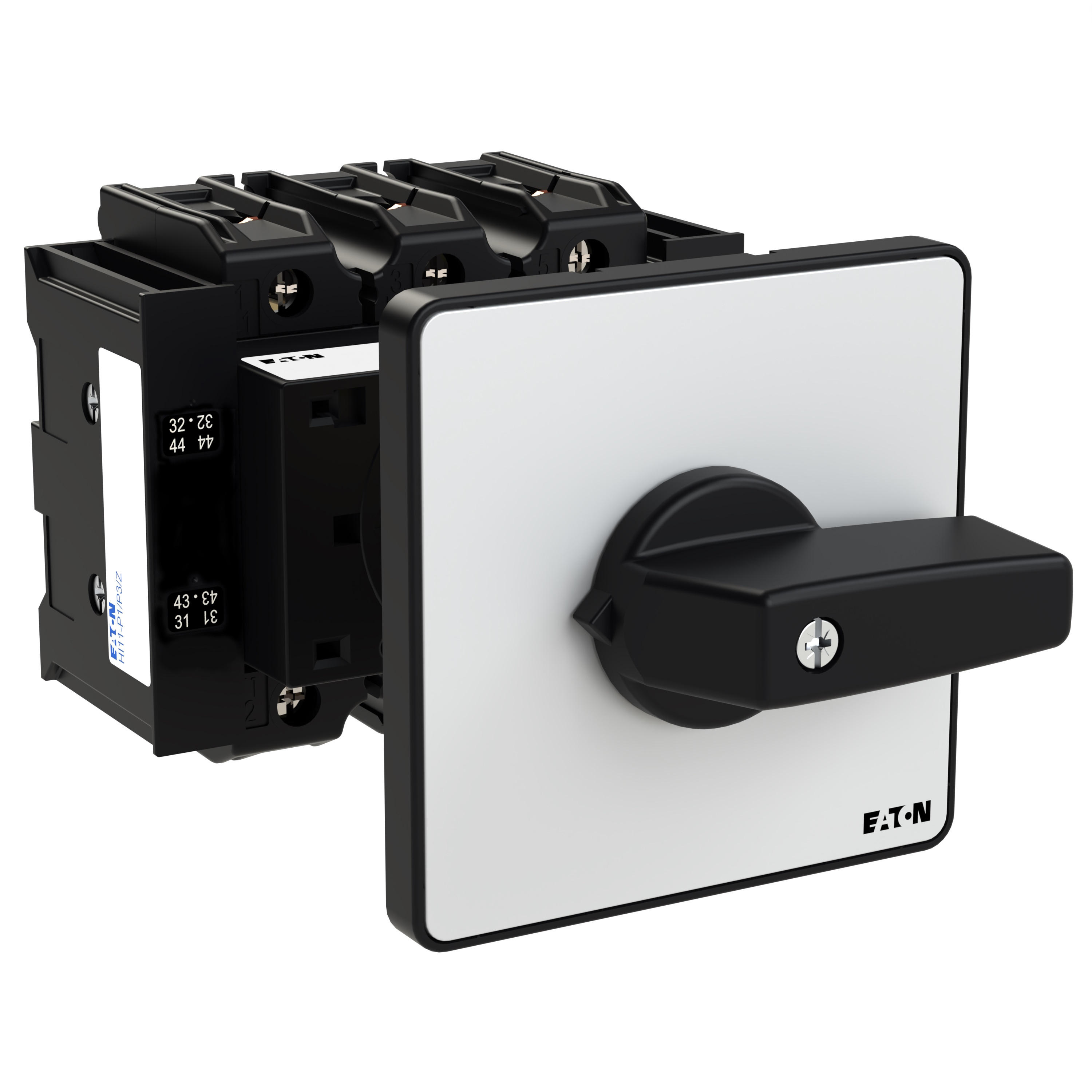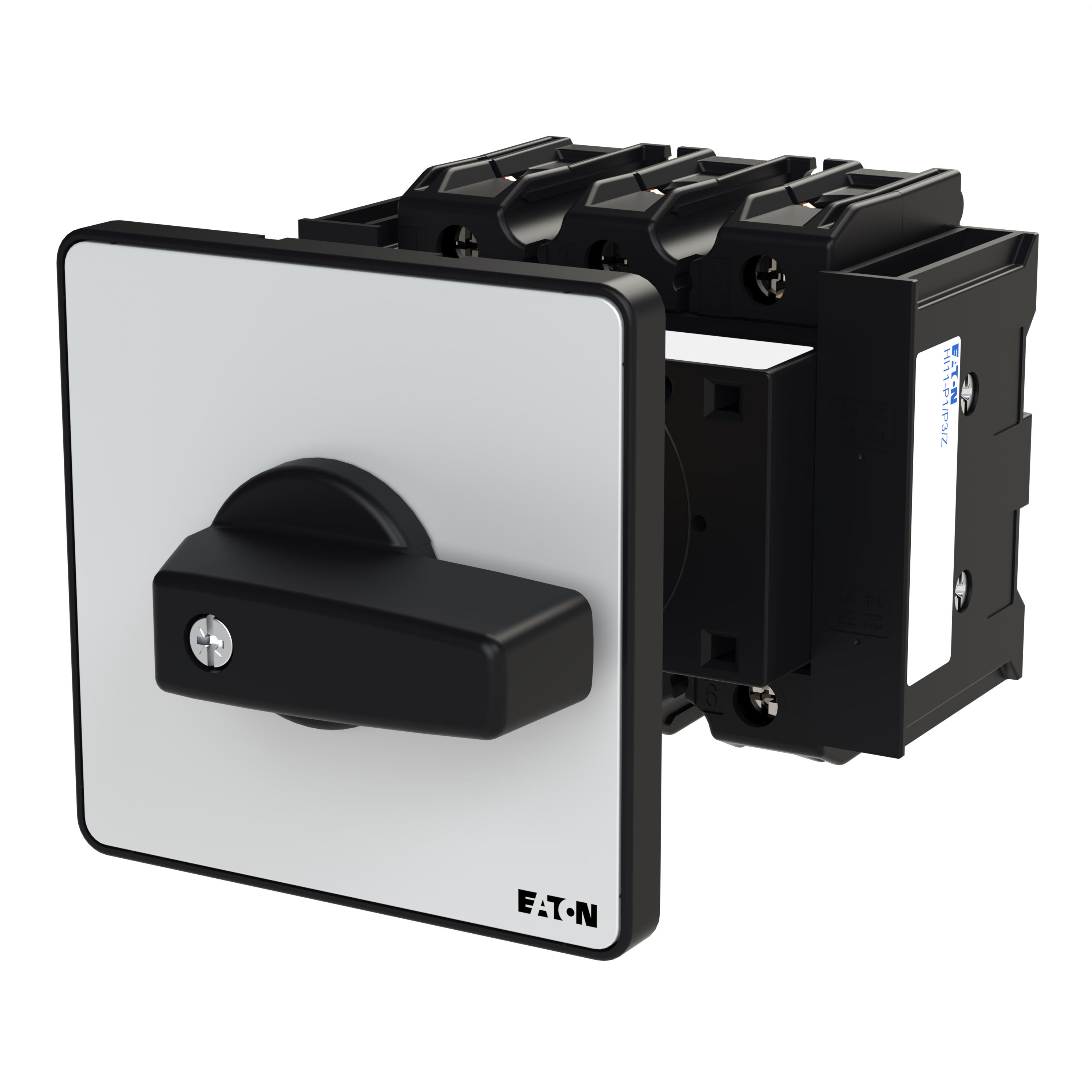 Przełącznik wł.-wył., Zacisk śrubowy: Przełącznik wł.-wył., Odniesienie grupy części P3, z czarnym pokrętłem z tabliczką czołową, 3-biegunowy, Stopień ochrony: Przód IP65, Projekt: montaż na panelu tylnym, Moc znamionowa AC-23A, 50 - 60 Hz 400 V: P = 55 kW, Znamionowy prąd ciągły: Iu = 100 A, Normy: IEC/EN 60947, VDE 0660, IEC/EN 60204, CSA, UL, Rozłącznik izolacyjny zgodnie z normą IEC/EN 60947-3