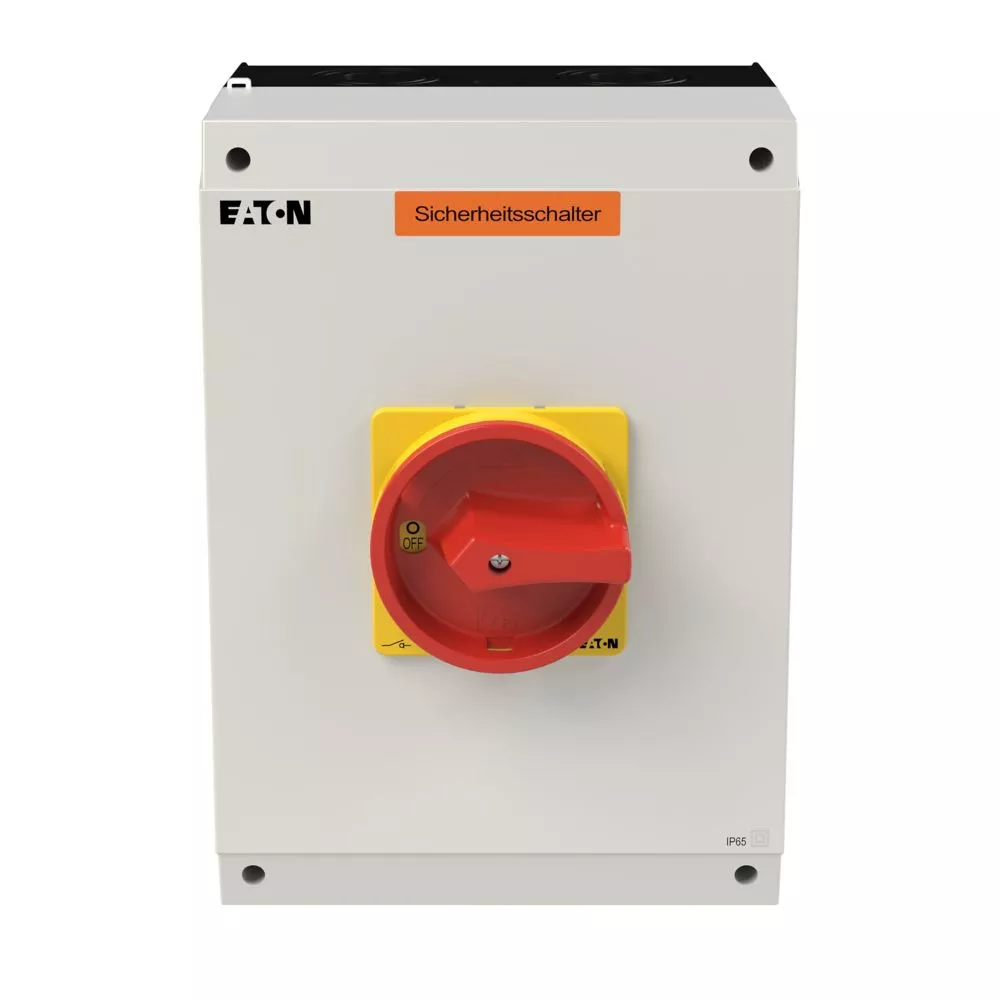 Rozłącznik bezpieczeństwa, Zacisk śrubowy: rozłącznik bezpieczeństwa, Odniesienie grupy części P3, Funkcja zatrzymania: Funkcja wyłączania awaryjnego, z czerwonym uchwytem obrotowym i żółtym pierścieniem blokującym, Uwagi: z etykietą ostrzegawczą „rozłącznik bezpieczeństwa”, Informacje dotyczące dostarczonego sprzętu: Styk pomocniczy lub przewód neutralny montowany przez użytkownika., 3-biegunowy, Element blokujący: możliwość zablokowania w położeniu 0 za pomocą blokady pokrywy, Stopień ochrony: IP65, Projekt: montaż powierzchniowy, Moc znamionowa AC-23A, 50 - 60 Hz 400 V: P = 55 kW, Znamionowy prąd ciągły: Iu = 100 A, Normy: IEC/EN 60947, VDE 0660, IEC/EN 60204, Rozłącznik izolacyjny zgodnie z normą IEC/EN 60947-3