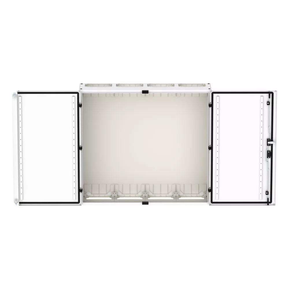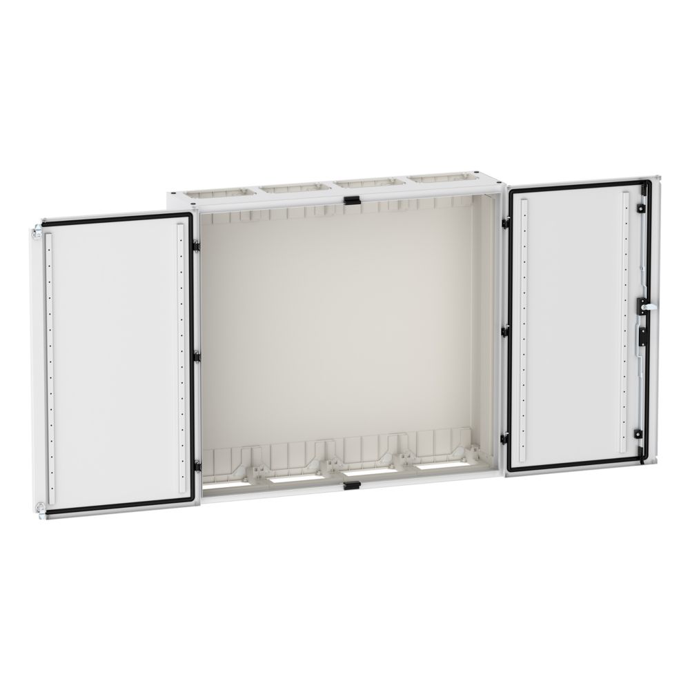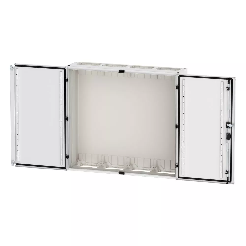Wandmontiertes Gehäuse EP Modular Class 2 (EMC2) leer, IP55, Schutzklasse II, HxBxT=950x1050x270 mm, weiß (RAL 9016), pulverbeschichtetes Gehäuse aus Stahlblech, vollständig innen isoliert, gemäß Anforderungen der Schutzklasse II, vorbereitet für F3A-Flansche oben/unten, Tür mit externen Scharnieren, 180° Öffnungswinkel, Standardlieferung mit Schwenkhebel, rundum geschäumte Türdichtung, zur Verwendung mit EP Installationssystem für Innenausstattung;