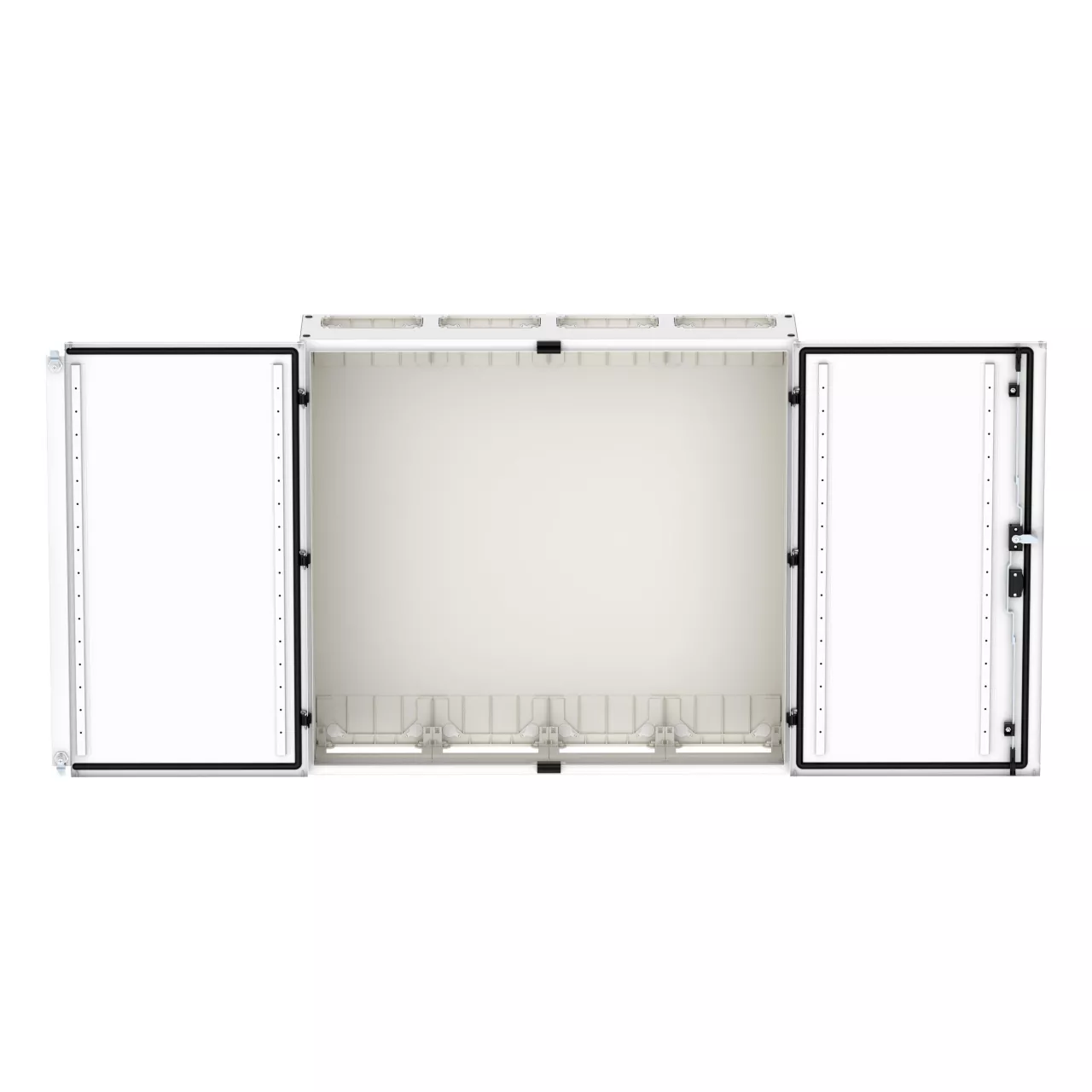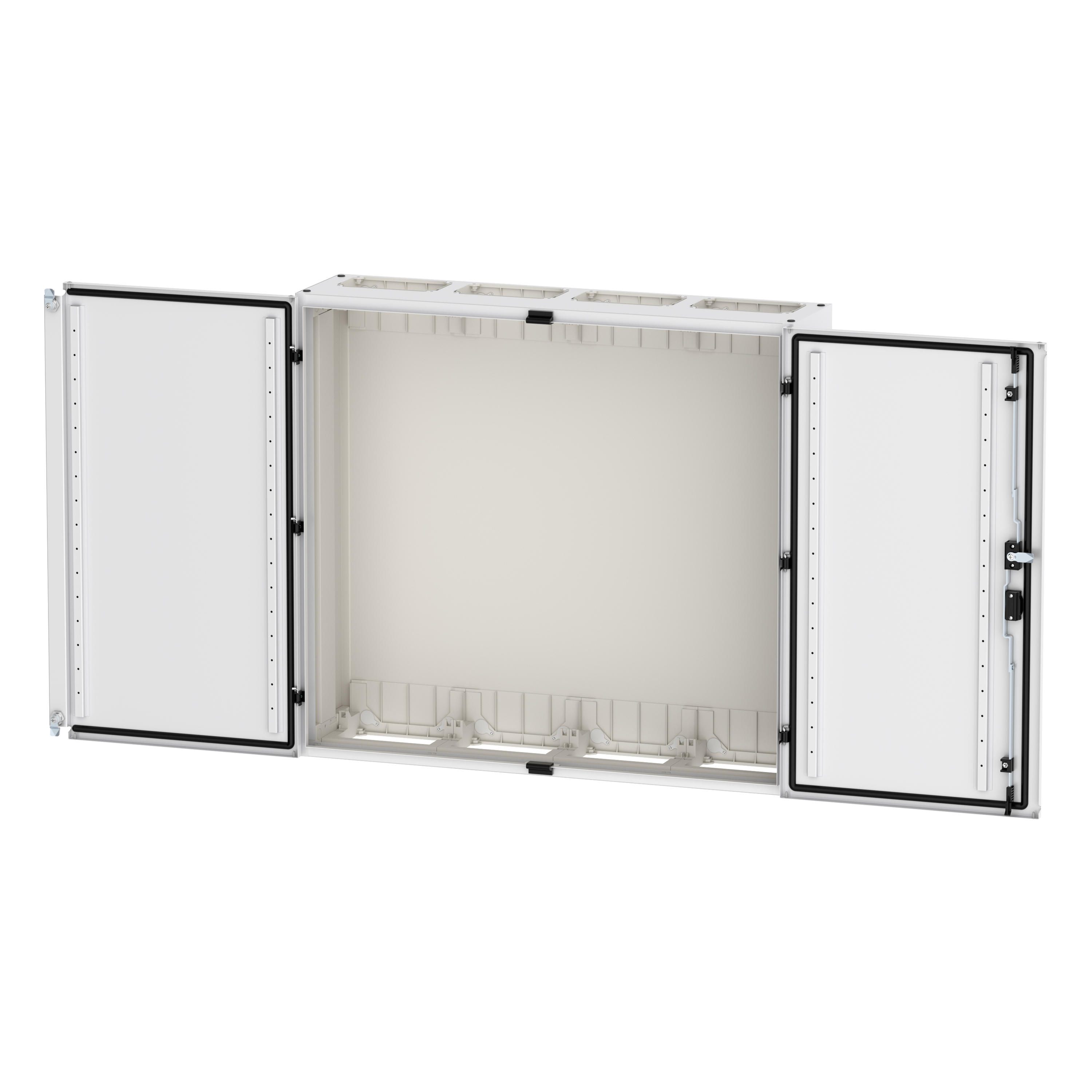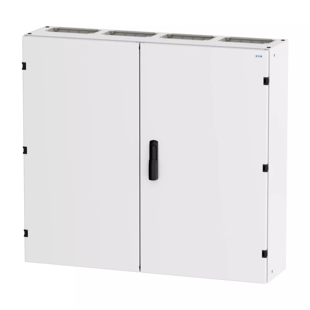 Wandmontiertes Gehäuse EP Modular Class 2 (EMC2) leer, IP55, Schutzklasse II, HxBxT=950x1050x270 mm, weiß (RAL 9016), pulverbeschichtetes Gehäuse aus Stahlblech, vollständig innen isoliert, gemäß Anforderungen der Schutzklasse II, vorbereitet für F3A-Flansche oben/unten, Tür mit externen Scharnieren, 180° Öffnungswinkel, Standardlieferung mit Schwenkhebel, rundum geschäumte Türdichtung, zur Verwendung mit EP Installationssystem für Innenausstattung;