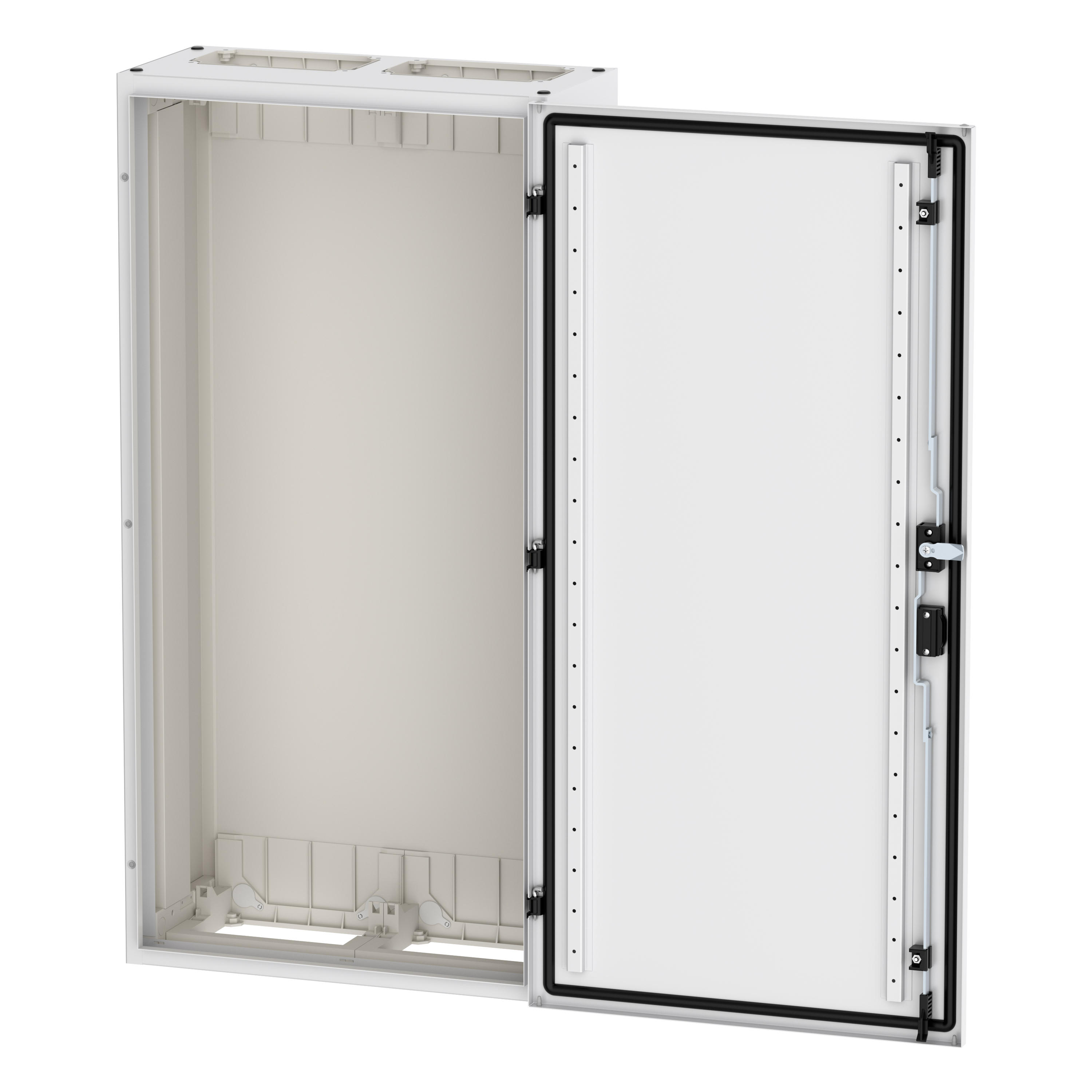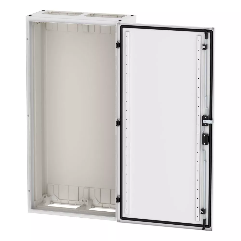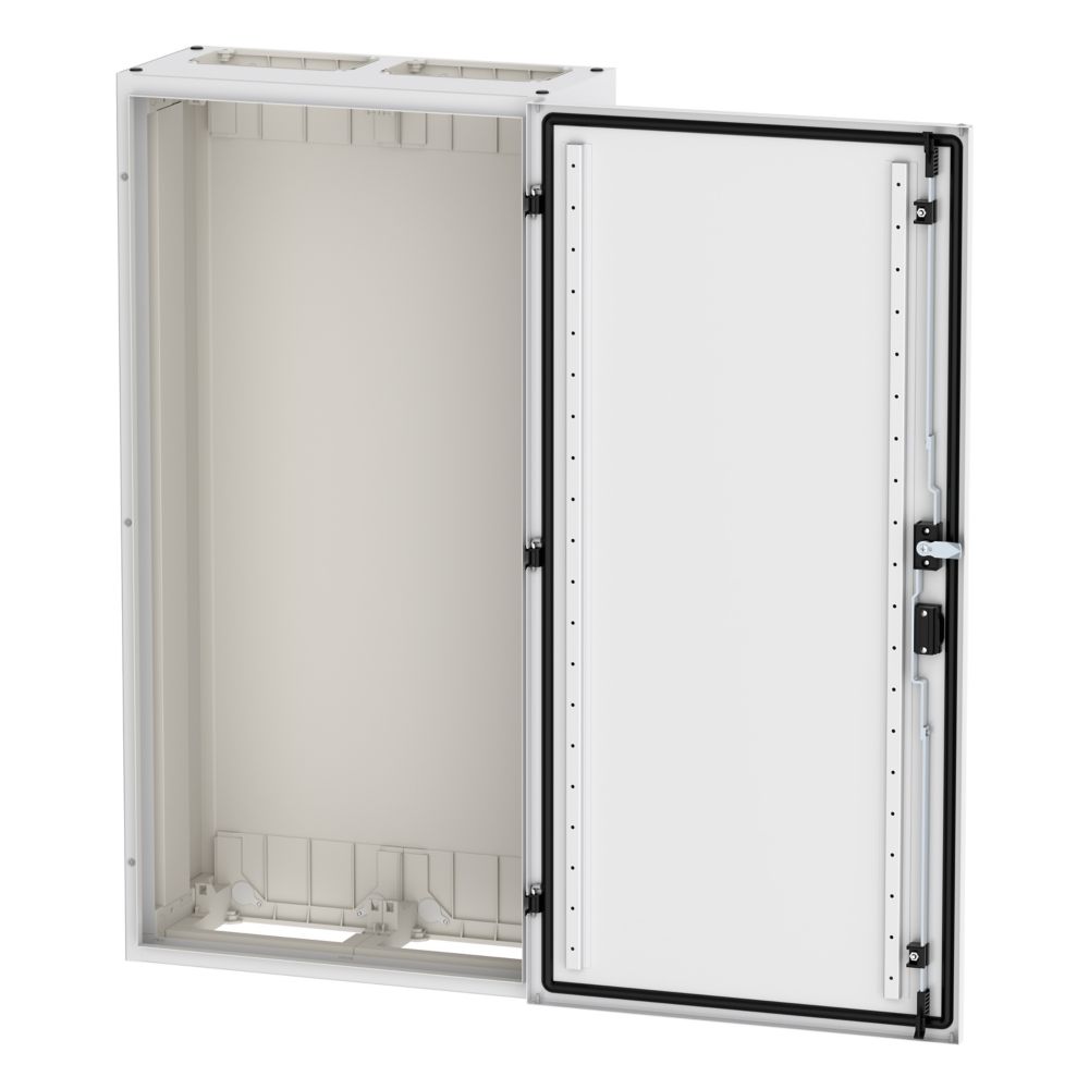 Wandmontiertes Gehäuse EP Modular Class 2 (EMC2) leer, IP55, Schutzklasse II, HxBxT=1100x550x270 mm, weiß (RAL 9016), pulverbeschichtetes Gehäuse aus Stahlblech, vollständig innen isoliert, gemäß Anforderungen der Schutzklasse II, vorbereitet für F3A-Flansche oben/unten, Tür mit externen Scharnieren, 180° Öffnungswinkel, Standardlieferung mit Schwenkhebel, rundum geschäumte Türdichtung, zur Verwendung mit EP Installationssystem für Innenausstattung;