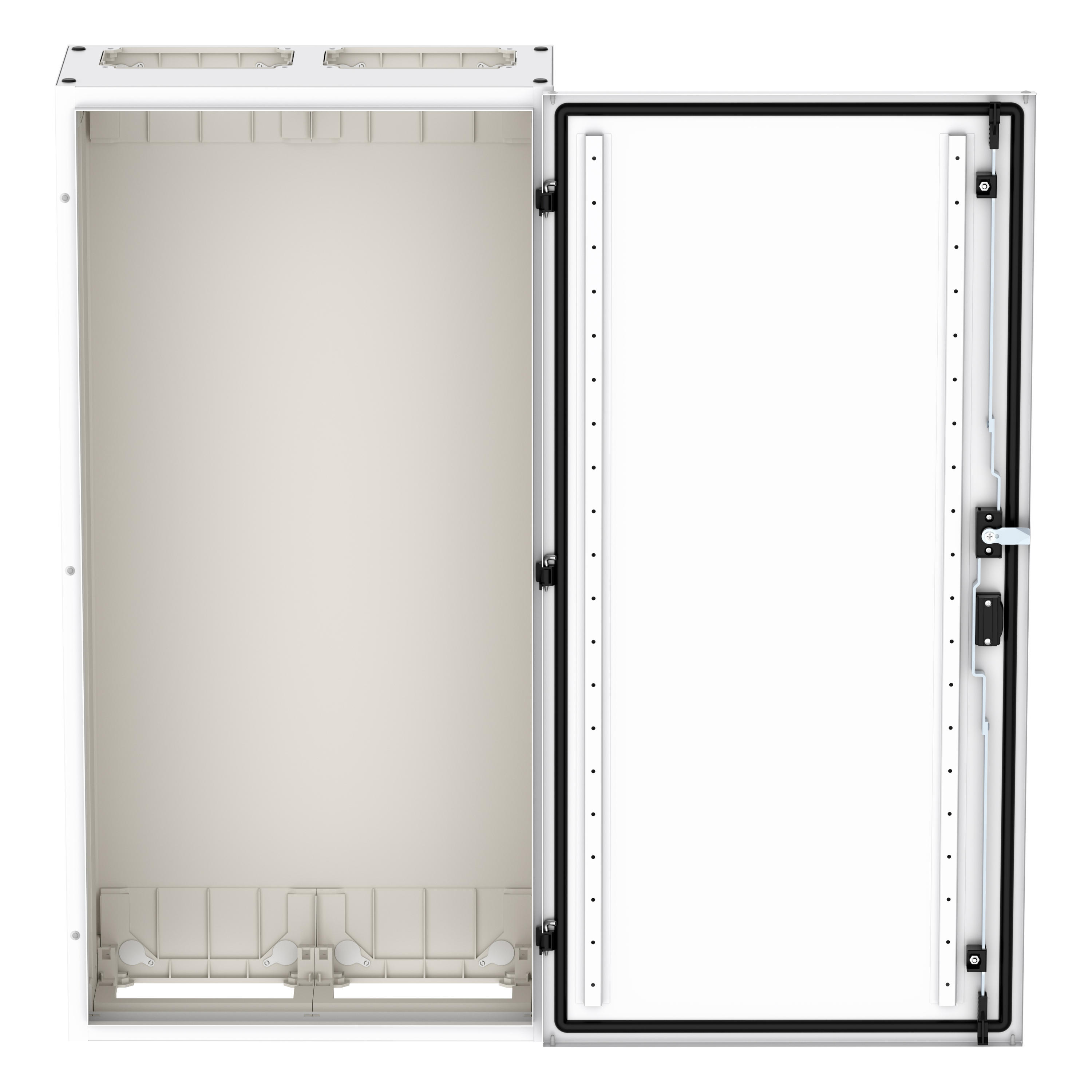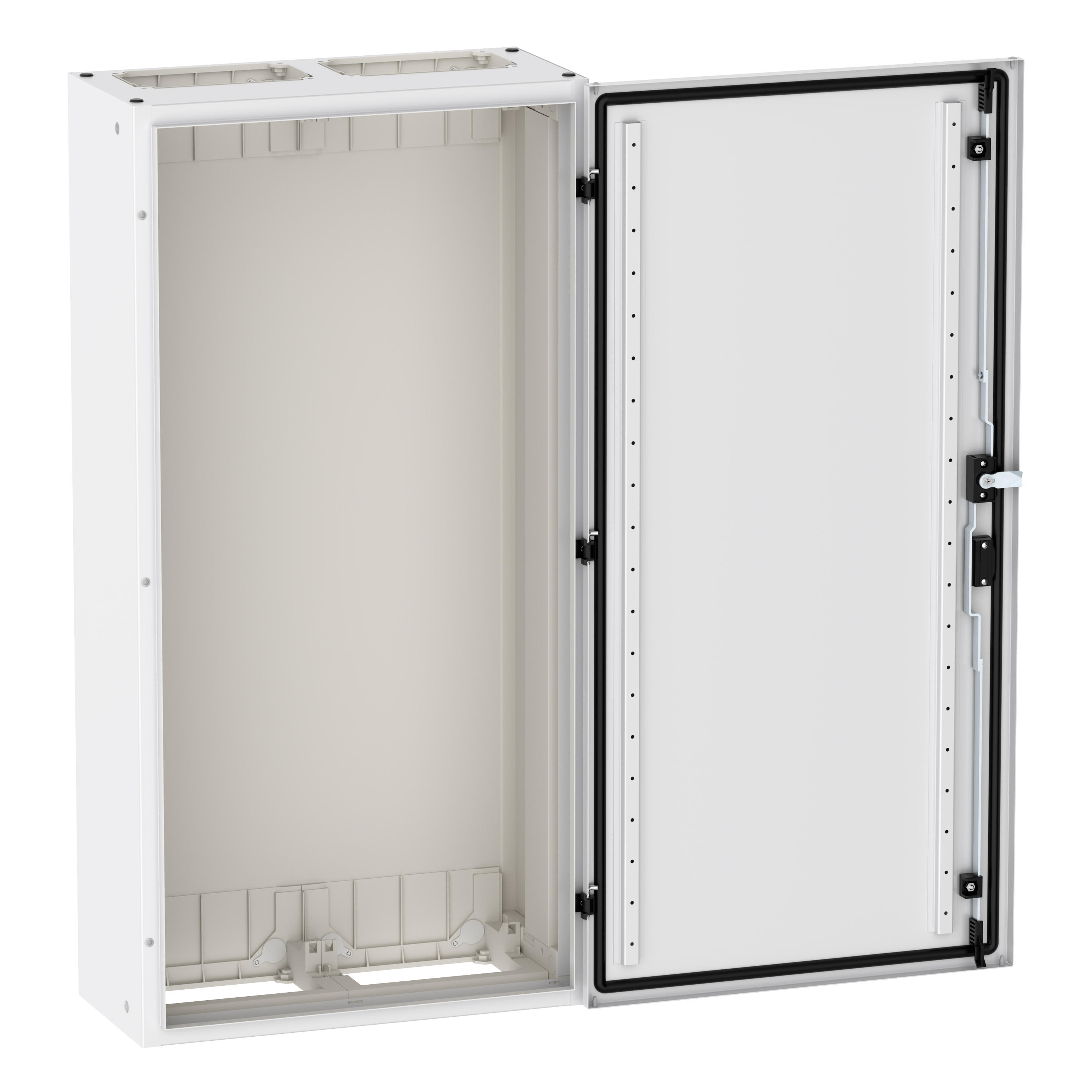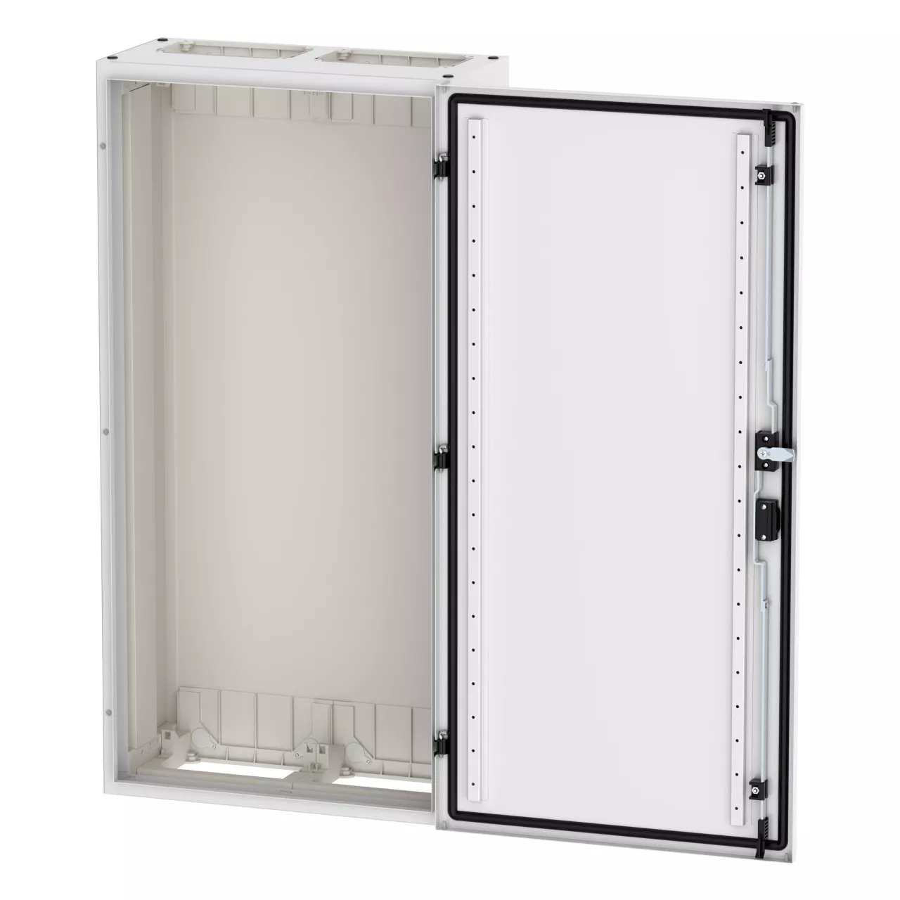 Wandmontiertes Gehäuse EP Modular Class 2 (EMC2) leer, IP55, Schutzklasse II, HxBxT=1100x550x270 mm, weiß (RAL 9016), pulverbeschichtetes Gehäuse aus Stahlblech, vollständig innen isoliert, gemäß Anforderungen der Schutzklasse II, vorbereitet für F3A-Flansche oben/unten, Tür mit externen Scharnieren, 180° Öffnungswinkel, Standardlieferung mit Schwenkhebel, rundum geschäumte Türdichtung, zur Verwendung mit EP Installationssystem für Innenausstattung;