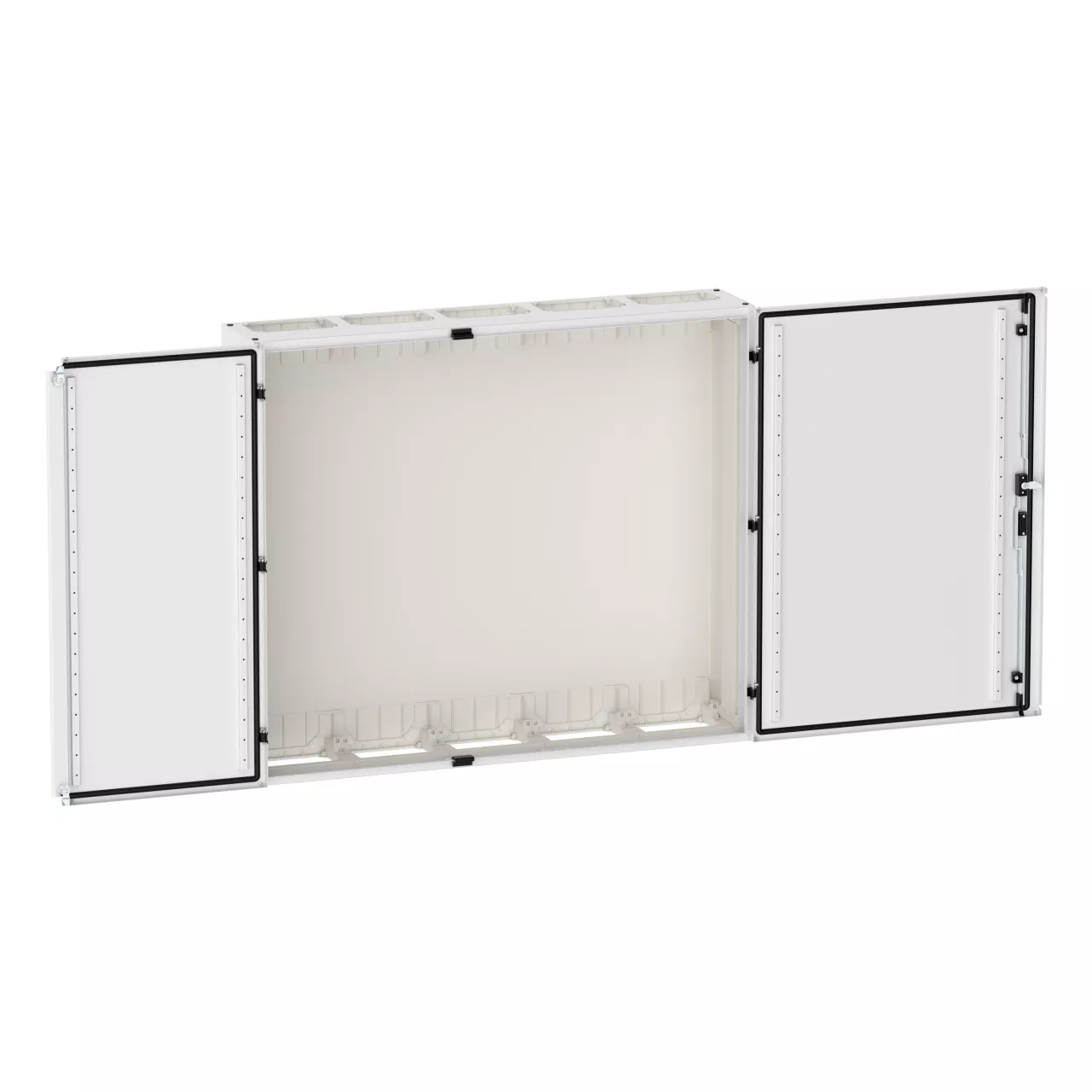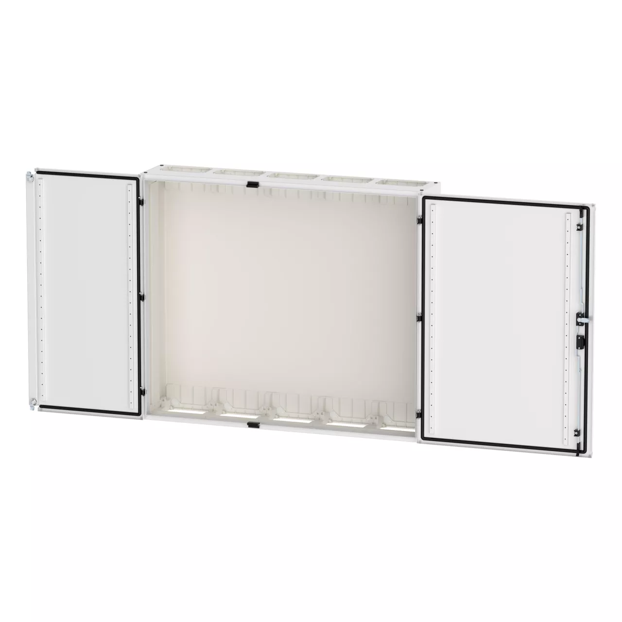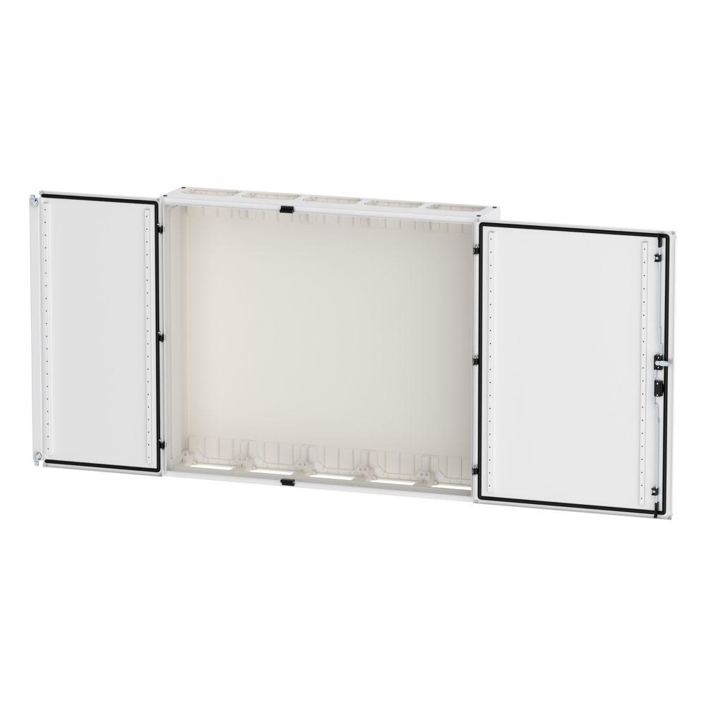 Wandmontiertes Gehäuse EP Modular Class 2 (EMC2) leer, IP55, Schutzklasse II, HxBxT=1100x130x270 mm, weiß (RAL 9016), pulverbeschichtetes Gehäuse aus Stahlblech, vollständig innen isoliert, gemäß Anforderungen der Schutzklasse II, vorbereitet für F3A-Flansche oben/unten, Tür mit externen Scharnieren, 180° Öffnungswinkel, Standardlieferung mit Schwenkhebel, rundum geschäumte Türdichtung, zur Verwendung mit EP Installationssystem für Innenausstattung;