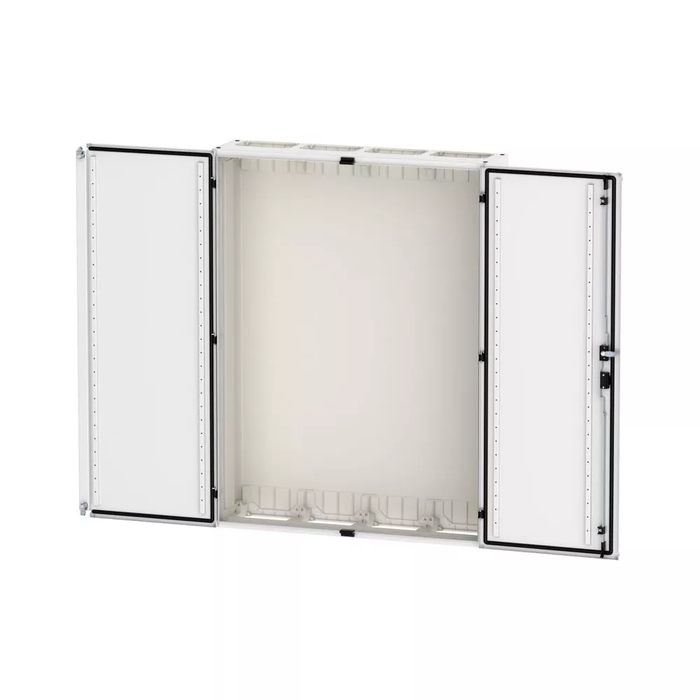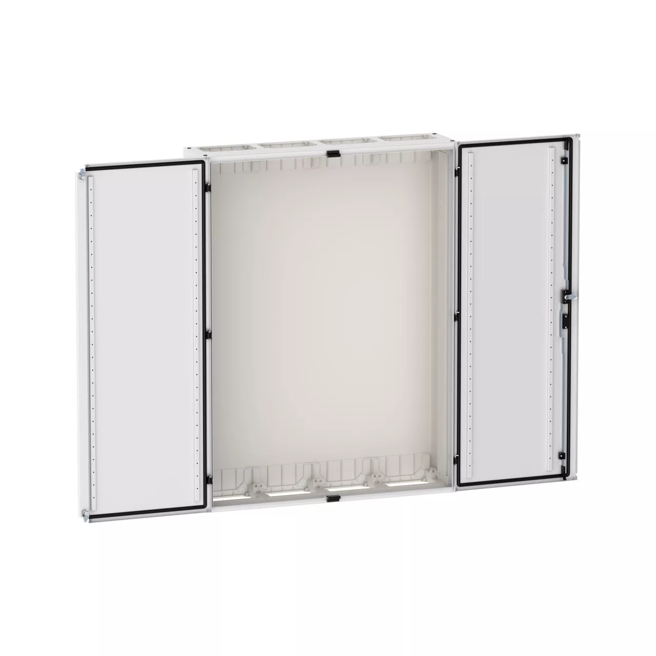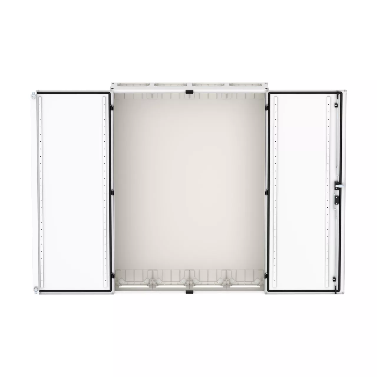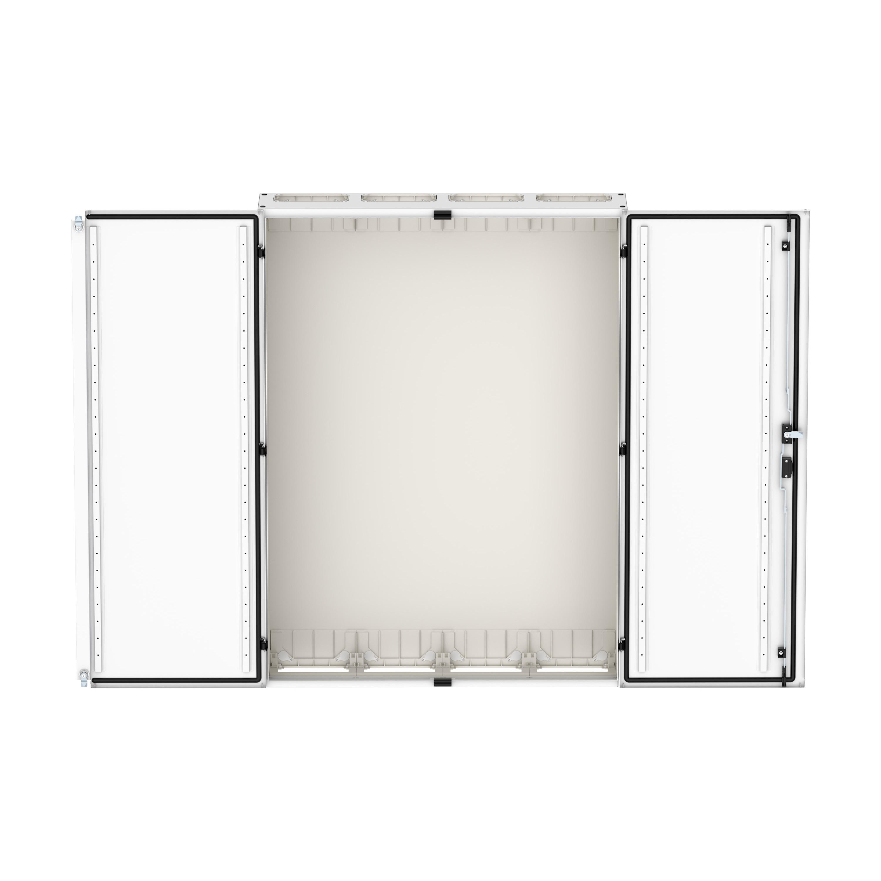 Wandmontiertes Gehäuse EP Modular Class 2 (EMC2) leer, IP55, Schutzklasse II, HxBxT=1400x1050x270 mm, weiß (RAL 9016), pulverbeschichtetes Gehäuse aus Stahlblech, vollständig innen isoliert, gemäß Anforderungen der Schutzklasse II, vorbereitet für F3A-Flansche oben/unten, Tür mit externen Scharnieren, 180° Öffnungswinkel, Standardlieferung mit Schwenkhebel, rundum geschäumte Türdichtung, zur Verwendung mit EP Installationssystem für Innenausstattung;
