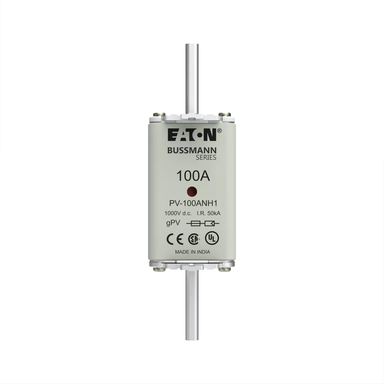 Bezpiecznik, wkładka topikowa, szybka, 100 A, 1000 V DC, NH1, gPV, UL PV, UL, IEC, podwójny (kombinowany) system wskaźników, korpus prostopadłościenny z zaciskami nożowymi, nieizolowane uchwyty, ochrona skrzynek łączących macierzy fotowoltaicznych, IEC 60269-6, UL 2579, zdolność wyłączania 50 kA, opcjonalne akcesoria, podstawa bezpiecznikowa SD1-D-PV