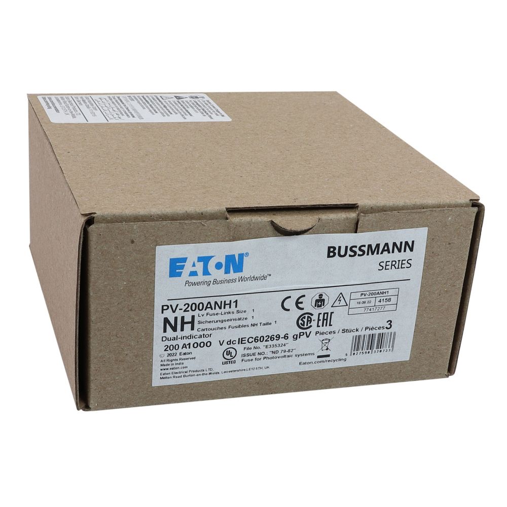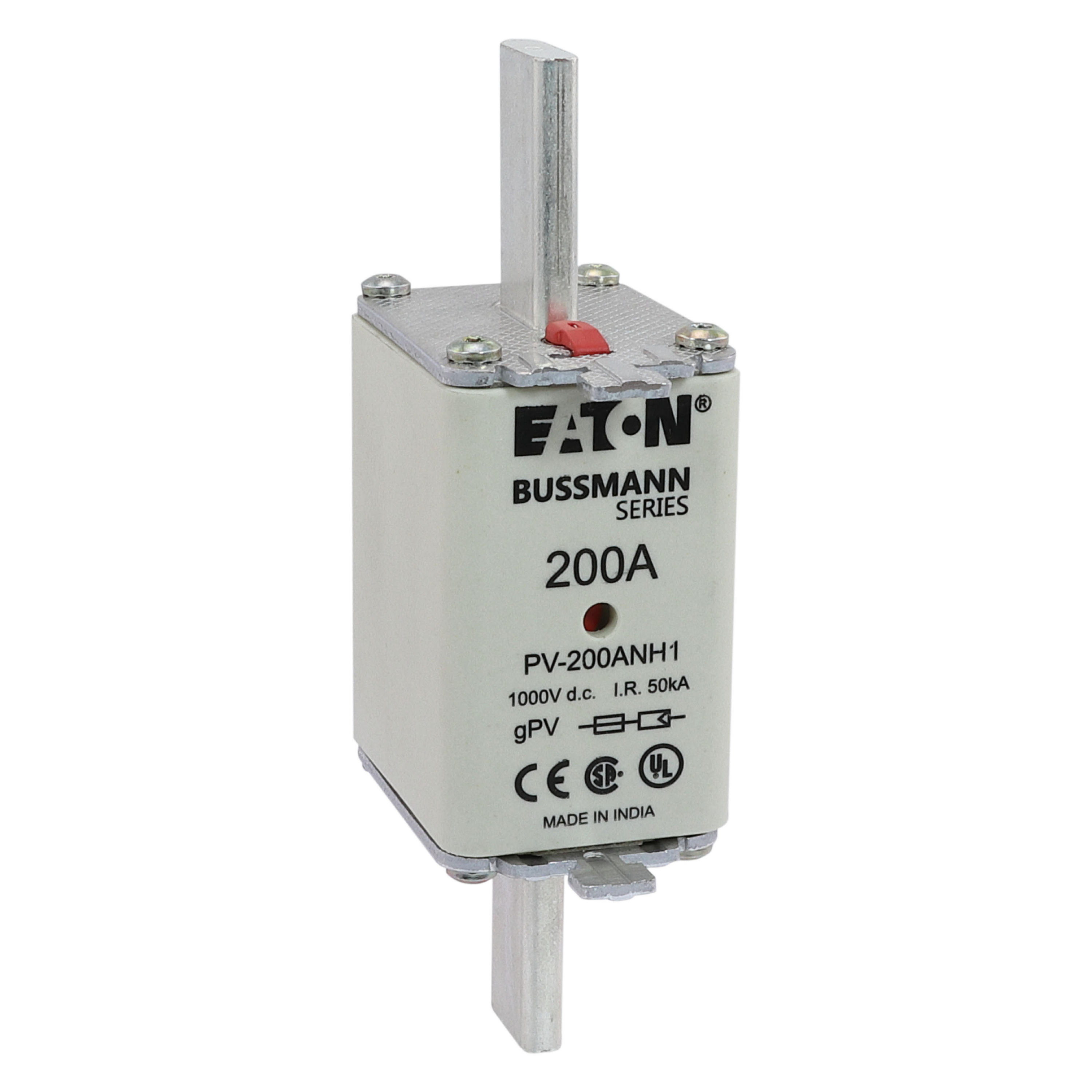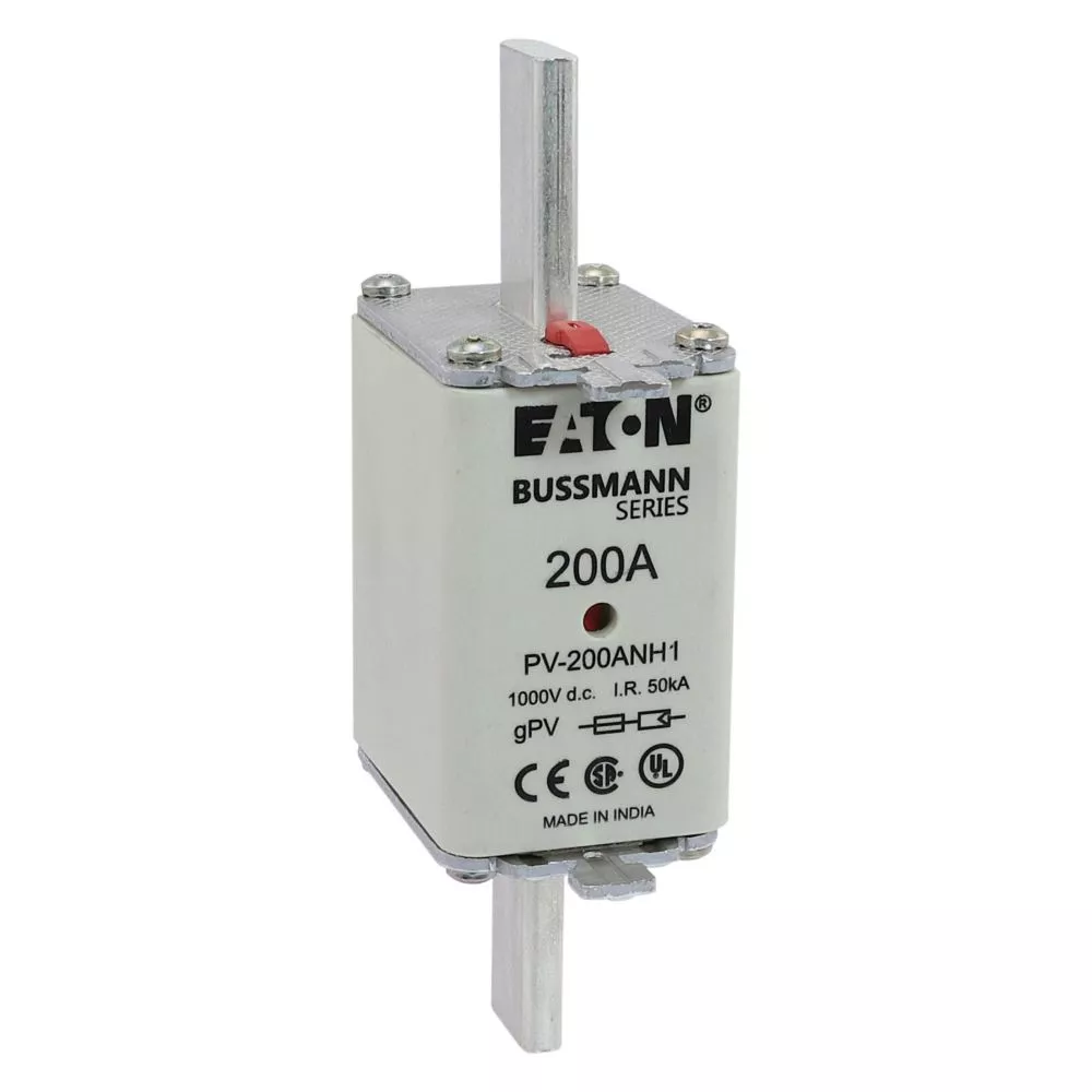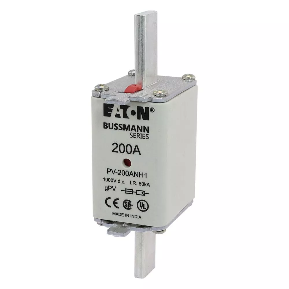 Bezpiecznik, wkładka topikowa, szybka, 200 A, 1000 V DC, NH1, gPV, UL PV, UL, IEC, podwójny wskaźnik, korpus prostopadłościenny z zaciskami nożowymi, uchwyty nieizolowane, ochrona łączników i rozłączników paneli fotowoltaicznych, UL 2579, IEC 60269-6, zdolność wyłączania 50 kA, opcjonalne akcesoria podstawa bezpiecznikowa SD1-D-PV