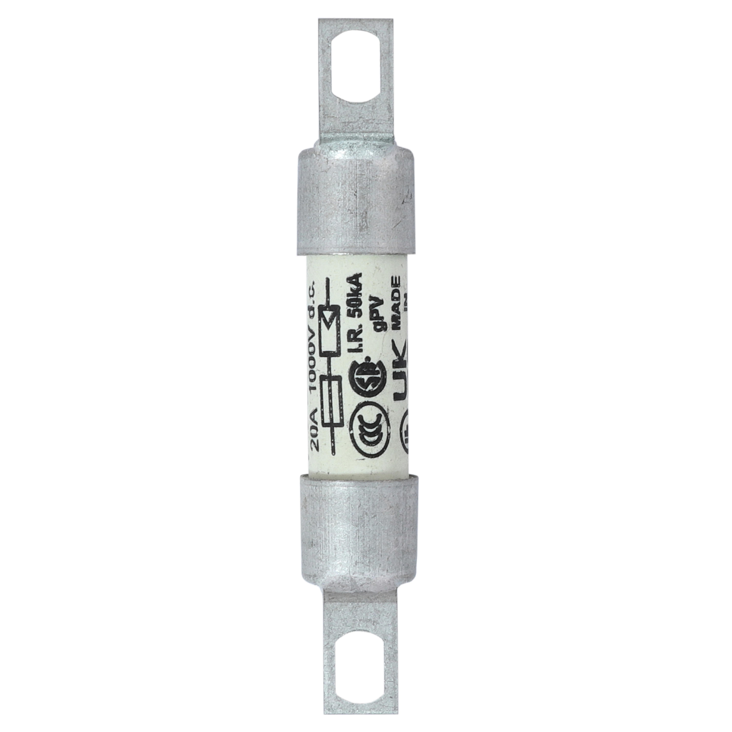 Sicherung, Sicherungseinsatz, superflink, 20 A, DC 1000 V, IEC 60269-6 Typ A, 10 x 59 mm, gPV, UL PV, IEC, UL, zylindrisch, gekröpfte verschraubte Anschlussfahnen, Photovoltaikschutz, IEC 60269-6, UL 249-19, Ausschaltvermögen 50 kA