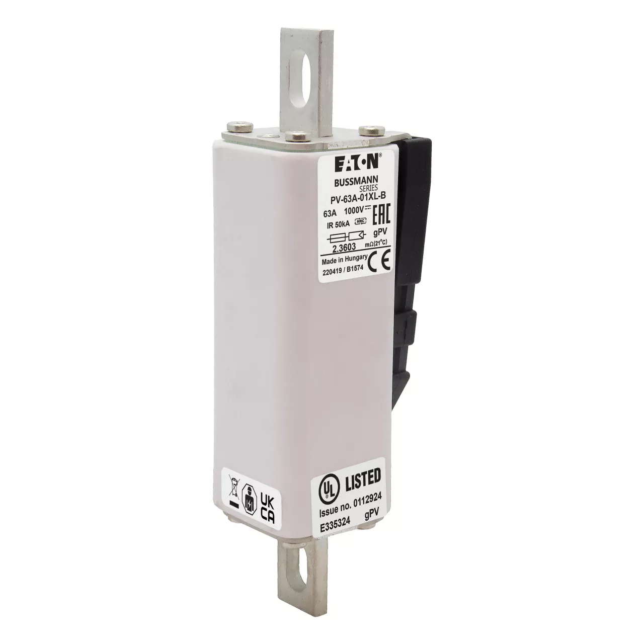 Bezpiecznik, wkładka topikowa, szybka, 63 A, 1000 V DC, 01XL, gPV, UL, IEC, korpus prostopadłościenny z zaciskami nożowymi przykręcanymi, skrzynki łączące macierzy fotowoltaicznych, IEC 60269-6, UL 2579, zdolność wyłączania 50 kA, opcjonalne akcesoria, mikroprzełącznik 170H0069