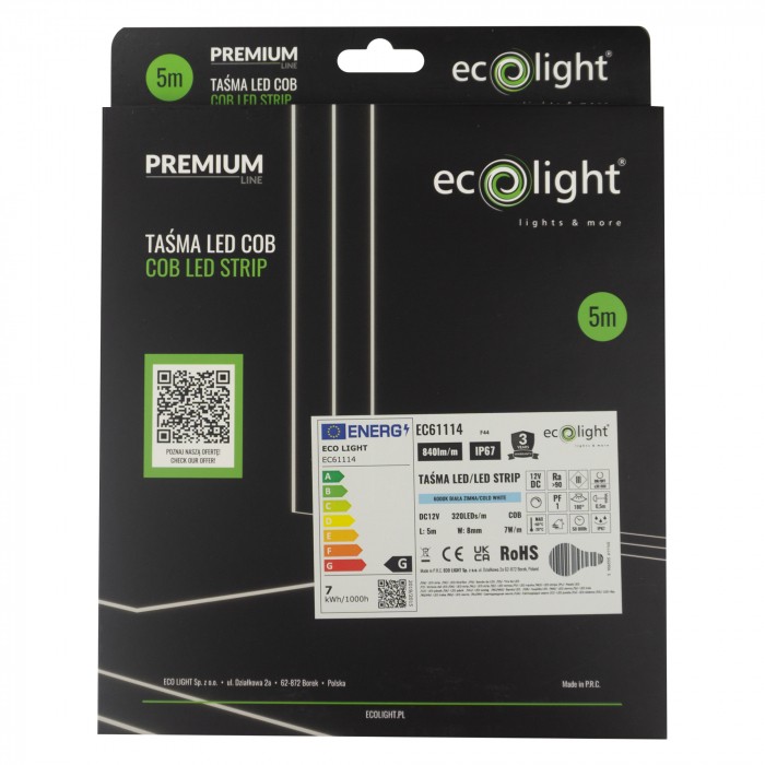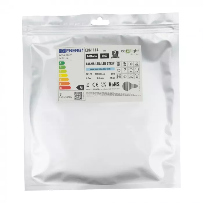Długość 5m Gwarancja 3 LATA Klasa energetyczna G Klasa szczelności IP67 Moc 7W/m Możliwość ściemniania TAK Napięcie 12V DC Rodzaj Taśma Led Szerokość 8mm Temperatura barwowa 6000K Ilość diod 320/m Kategoria Taśmy LED Marka ECO LIGHT Strumień świetlny 840lm/m Zbiorczy 100szt. Deklaracja zgodności https://cenniki.ecolight.pl/deklaracje-new/EC61114%20Deklaracja.pdf Instrukcja https://cenniki.ecolight.pl/instrukcje/tasmycob%20manual.pdf Karta katalogowa https://cenniki.ecolight.pl/karty-katalogowe/EC61114%20Karta%20katalogowa.pdf