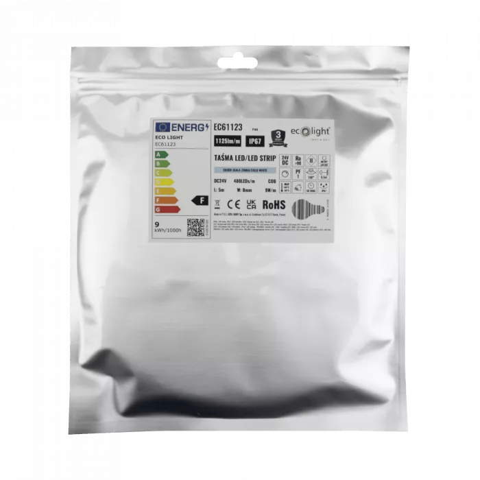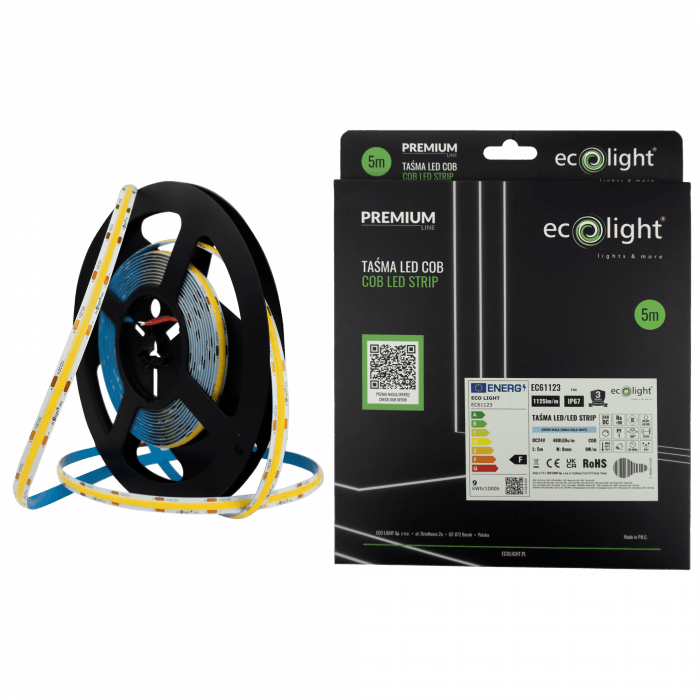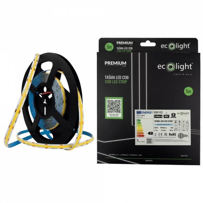 Profesjonalna taśma LED COB 24V o dużej jasności i zimnej białej barwie światła to doskonały wybór do wymagających zastosowań. Dzięki wysokiej gęstości diod (480/m) i technologii COB zapewnia jednolite, intensywne oświetlenie, bez efektu widocznych punktów świetlnych.
