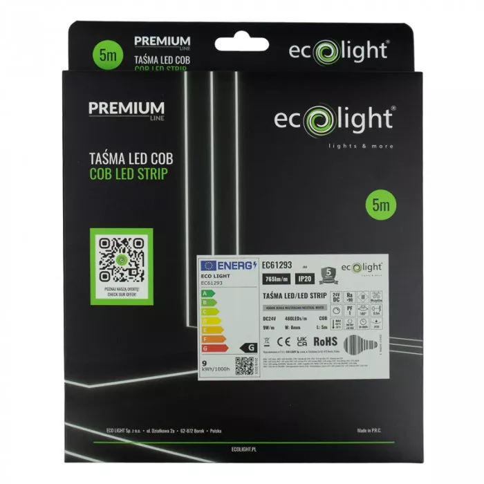 Taśma LED COB 480 24V 9W/m 4000K IP20 FREE CUT 5m