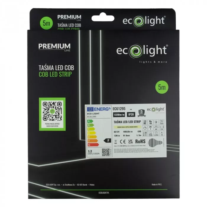 Taśma LED COB 480 12V 12W/m 1320lm/m 3000K IP20 5m