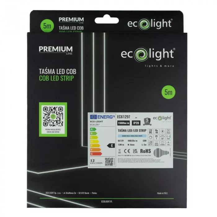 Taśma LED COB 480 12V 12W/m 1560lm/m 6000K IP20 5m