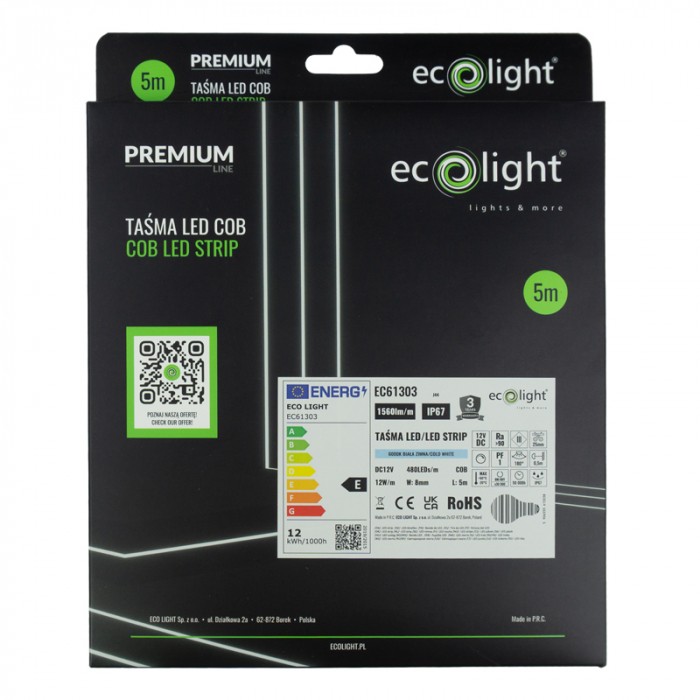 Taśma LED COB 480 12V 12W/m 1560lm/m 6000K IP67 5m