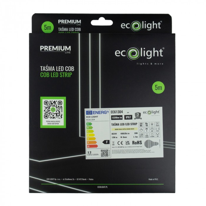 Taśma LED COB 480 24V to nowoczesne i wydajne rozwiązanie oświetleniowe, które łączy wysoką jakość wykonania z eleganckim efektem świetlnym. Dzięki technologii COB (Chip-on-Board), taśma emituje jednolitą linię światła bez widocznych punktów LED, co czyni ją idealną do zastosowań dekoracyjnych, meblowych i architektonicznych – zarówno wewnątrz, jak i na zewnątrz budynków.