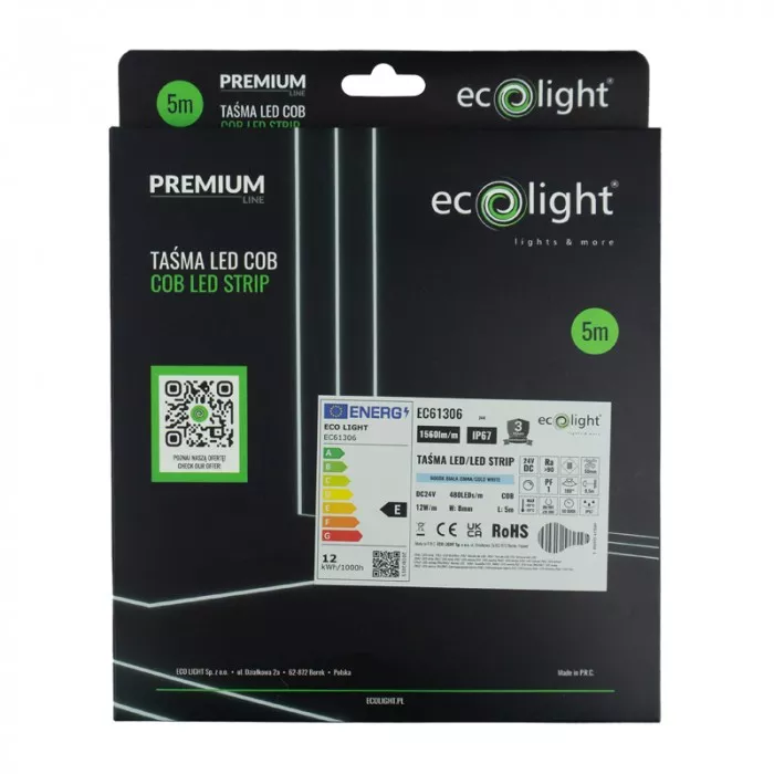 Taśma LED COB 480 24V 12W/m 1560lm/m 6000K IP67 5m