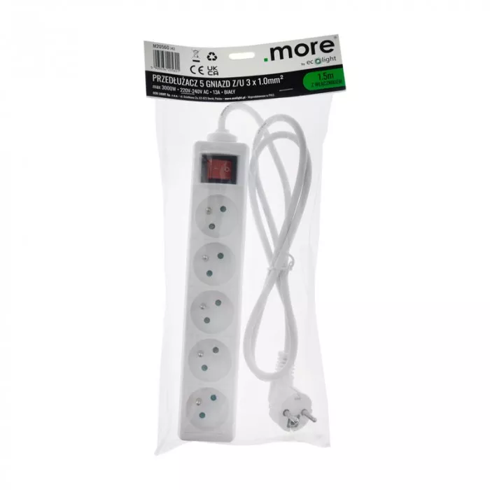 Przedłużacz 5 gniaz. 1.5m z/u z wyłącznikiem BIAŁY