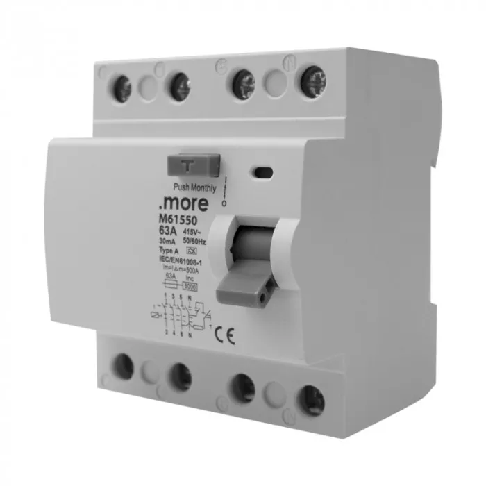 Wyłącznik różnicowoprądowy o znamionowym prądzie 63A, czułości 30mA, typu A oraz 4-polowy, przeznaczony do ochrony instalacji elektrycznych przed porażeniem prądem i niekontrolowanymi upływami prądu. Model typu A wykrywa zarówno prądy upływowe sinusoidalne, jak i pulsujące prądy stałe, co zwiększa jego zakres zastosowań w porównaniu z wersją typu AC.