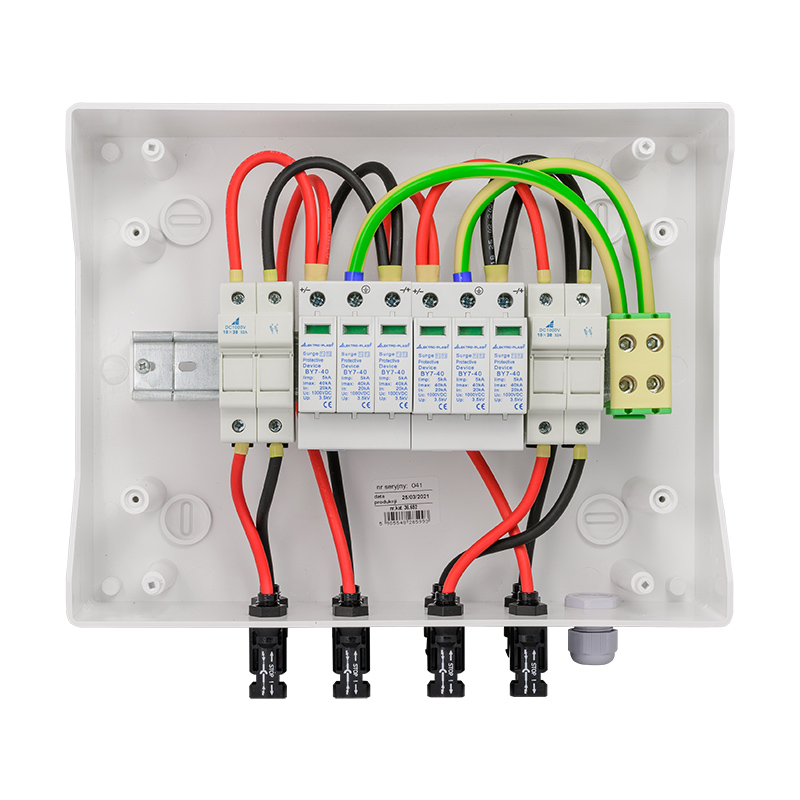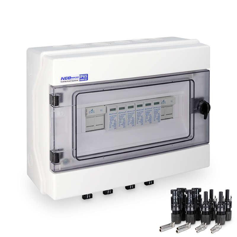 Rozdzielnice fotowoltaiczne są wyposażone w aparaturę chroniącą panele fotowoltaiczne i falowniki PV w instalacjach fotowoltaicznych przed przepięciami w obwodach DC, zwarciami wywołanymi wyładowaniami atmosferycznymi. Doceniane na rynkach europejskich rozdzielnice NEO series RH idealnie nadają się do montażu wewnątrz pomieszczeń. Posiadają wysoki stopień ochrony IP65, stopień wytrzymałości mechanicznej IK07 oraz II klasę ochronności. Napięcie znamionowe obudowy wynosi 1000V DC. Warystorowe ochronniki przepięć zapewniają klasę ochrony T1+T2 i gwarantują napięciowy poziom ochrony Up < 3,5 kV. Zabezpieczenie zwarciowe stanowią rozłączniki bezpiecznikowe 10x38 2P (wkładek bezpiecznikowych nie ma w zestawie).Niezawodne złącza MC4 do podłączenia łańcuchów modułów oraz dławik PG-16 zwiększają szybkość montażu i bezpieczeństwo. W zestawie dodatkowo znajdują się złącza MC4 do montażu na przewód solarny.
