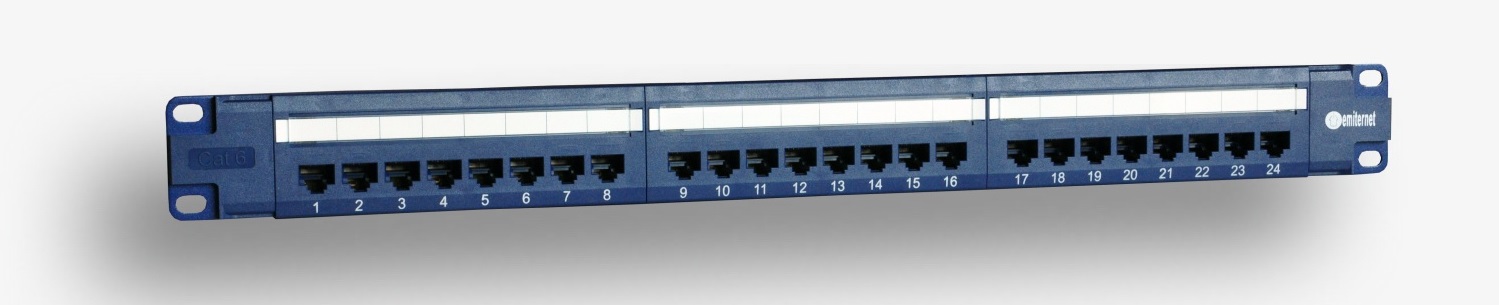Panel krosowy EmiterNet nieekranowany kat.6 szczególnie dedykowany w instalacjach teleinformatycznych z jednoczesną dystrybucją prądu do urządzeń zasilanych PoE/PoE+. Panele krosowe EmiterNet kat.6 zbudowano w oparciu o moduły PCB 8 portowe z oznaczeniem kolorowym (568A/B). Dostępne w wersji 24 portowej z frontowymi oznacznikami portów. Administrację okablowaniem ułatwiają oznaczenia portów. W komplecie znajduje się zestaw śrub montażowych, krawatki kablowe oraz instrukcja instalacji. Panel posiada w komplecie uchwyt montażowy (półkę), który ułatwia prowadzenie kabla. Zintegrowane z panelem pole opisowe. Standard 19", wysokość 1U - panel 24 portowy. Kolor niebieski.