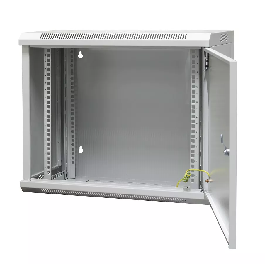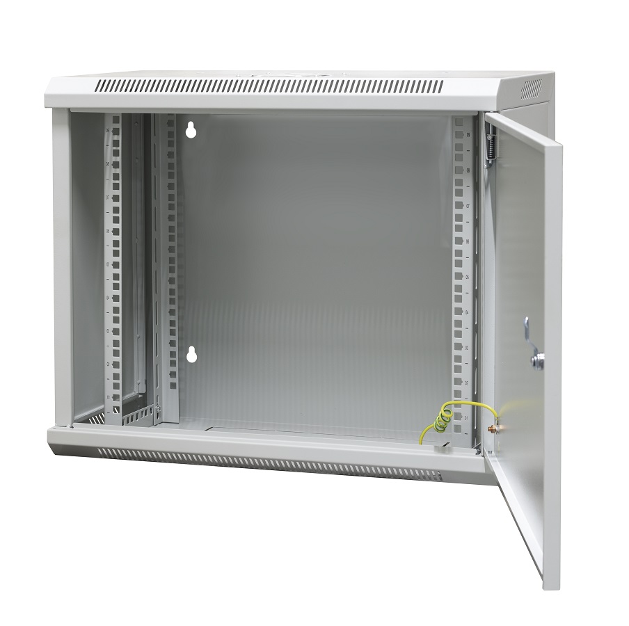 Szafa wisząca niedzielona 19'' 9U, drzwi całe z blachy, zamek, 600×300×500 szer./gł./wys. mm; RAL: 7044
