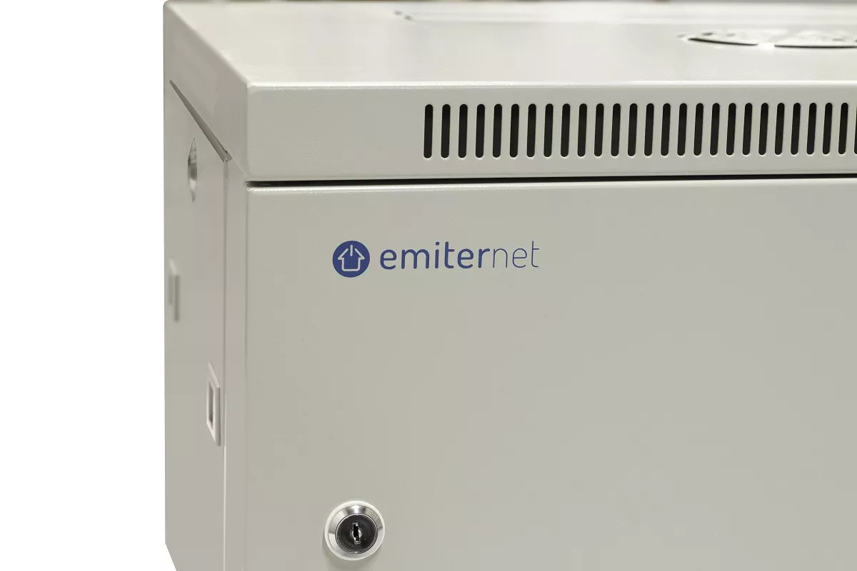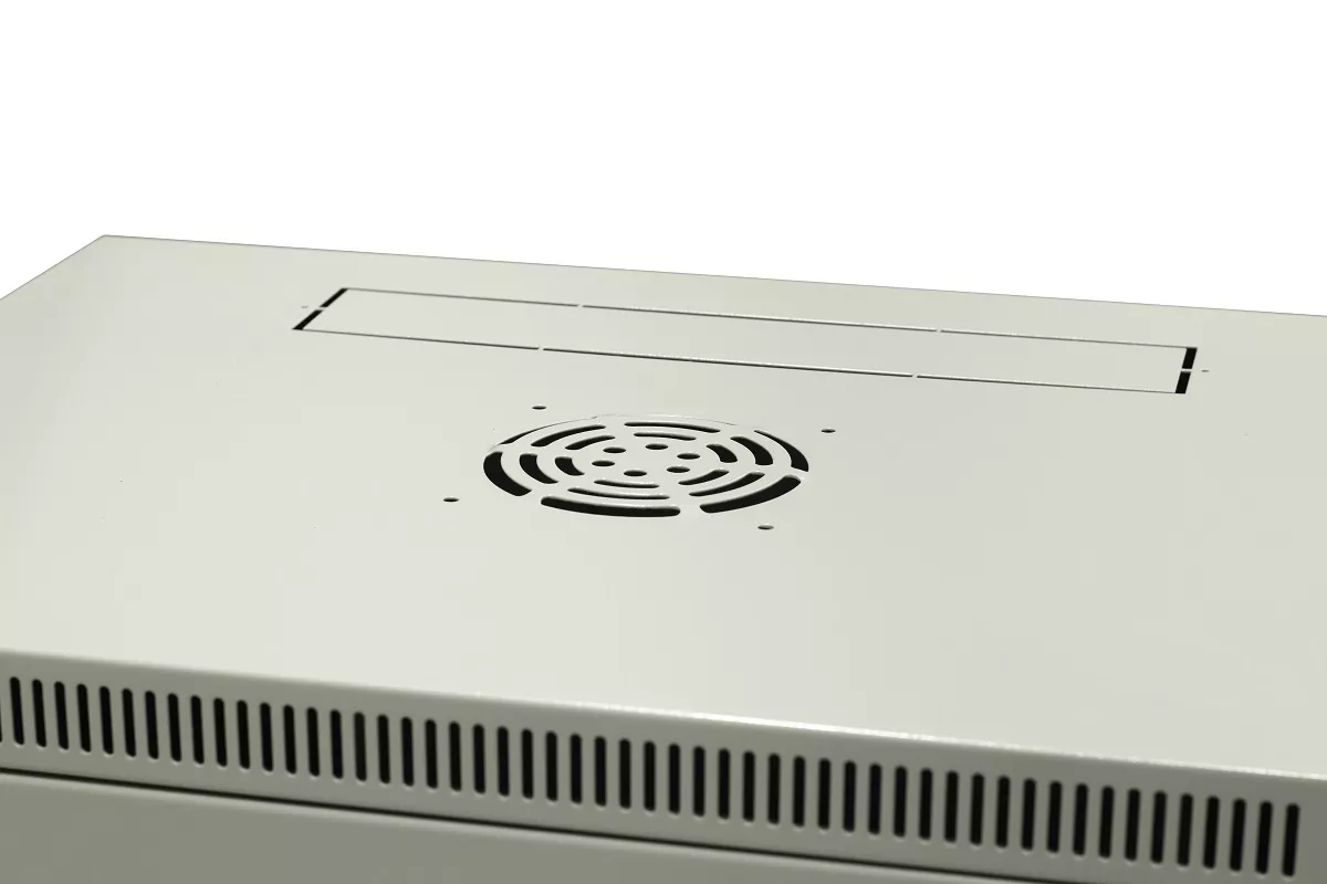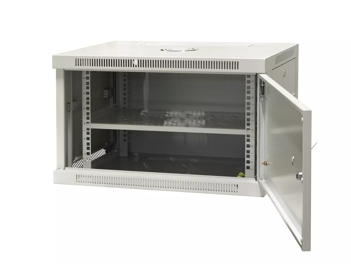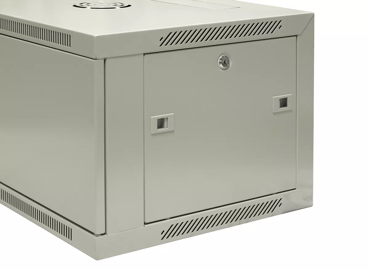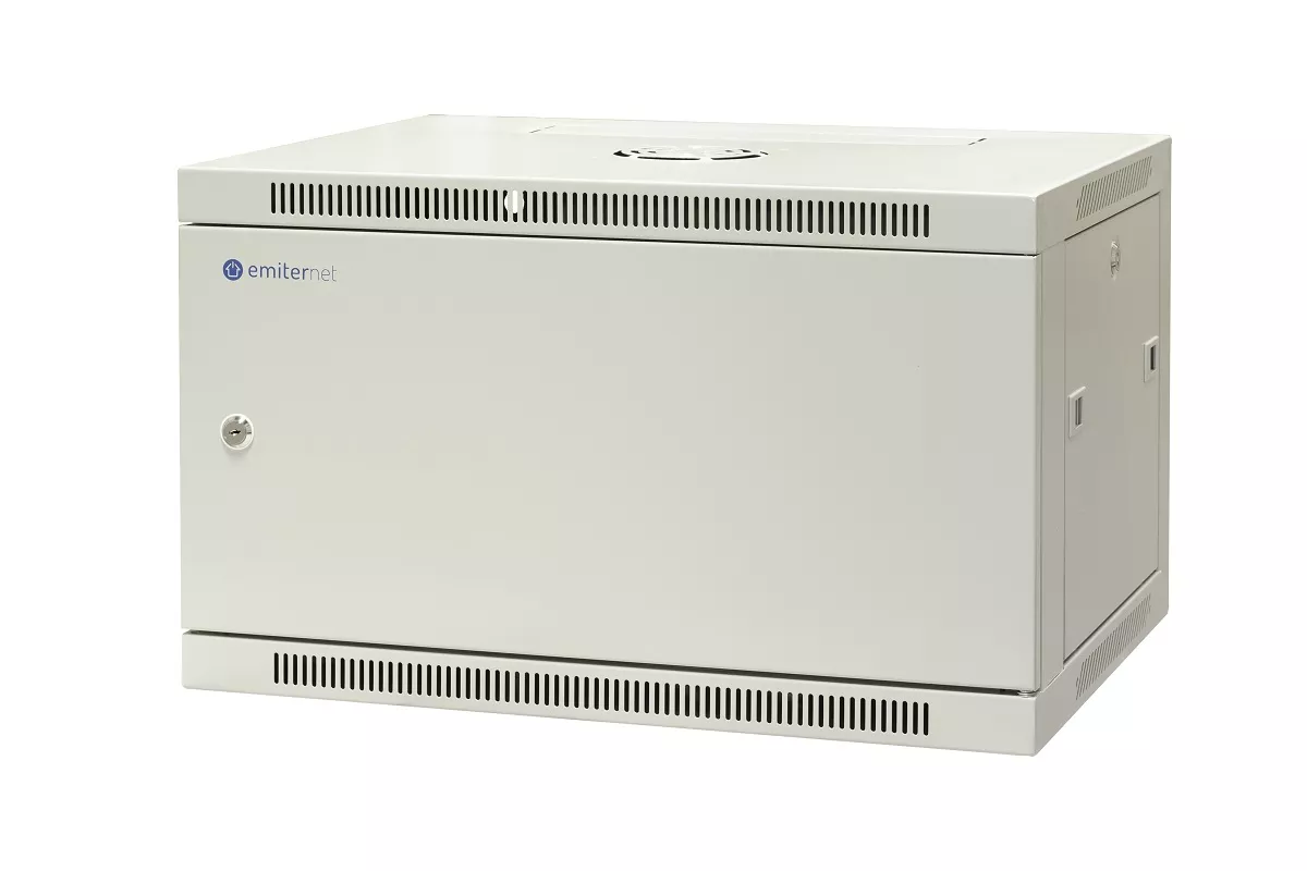 Szafa wisząca niedzielona 19'' 6U, drzwi całe z blachy, ściągane osłony boczne z zamkiem,600×450×370 szer./gł./wys. mm; RAL: szafa 7044, drzwi 7010