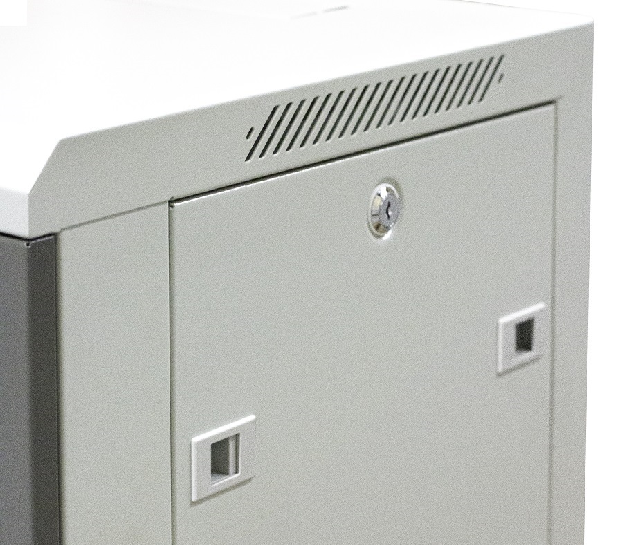 Szafa wisząca niedzielona 19'' 9U, drzwi blacha/szkło, ściągane osłony boczne z zamkiem, 600×450×500 szer./gł./wys. mm; RAL: szafa 7044, drzwi 7010