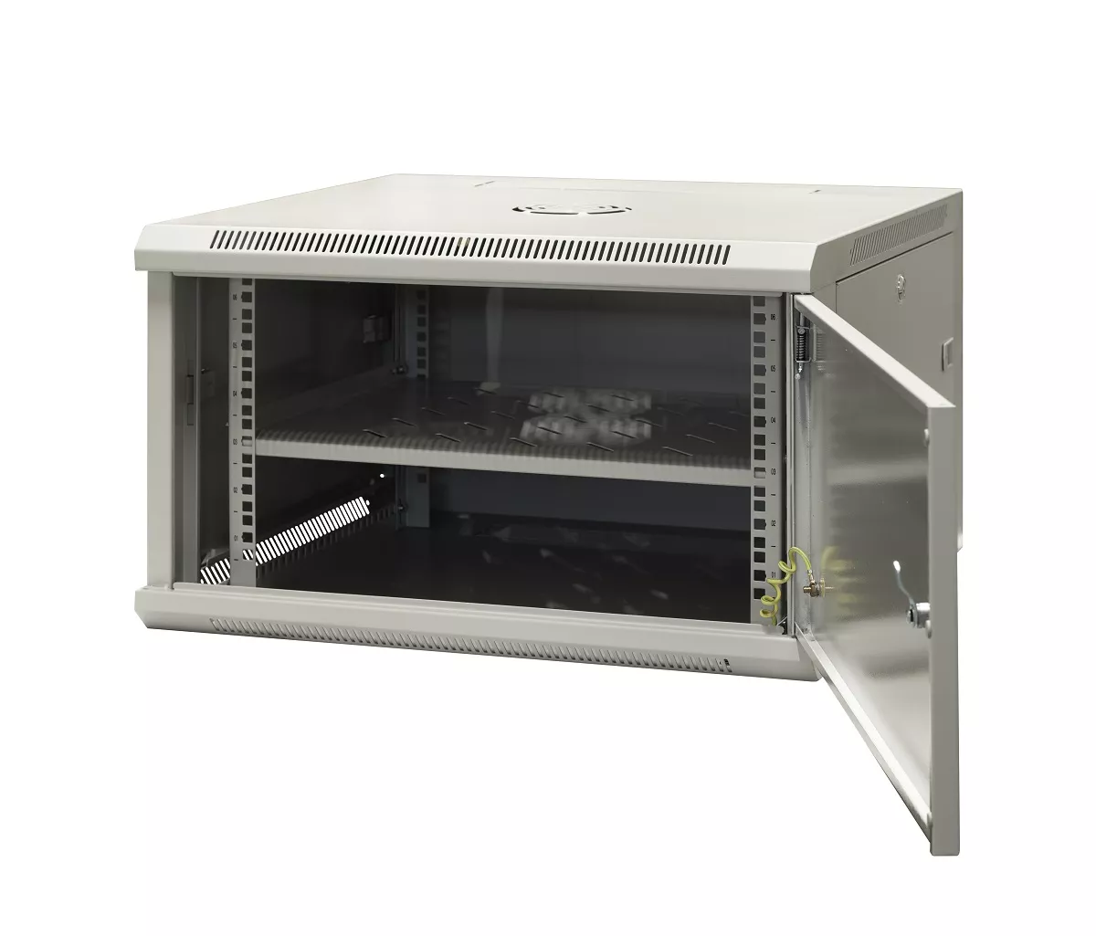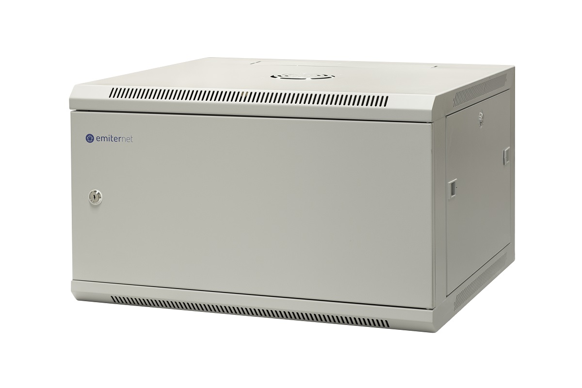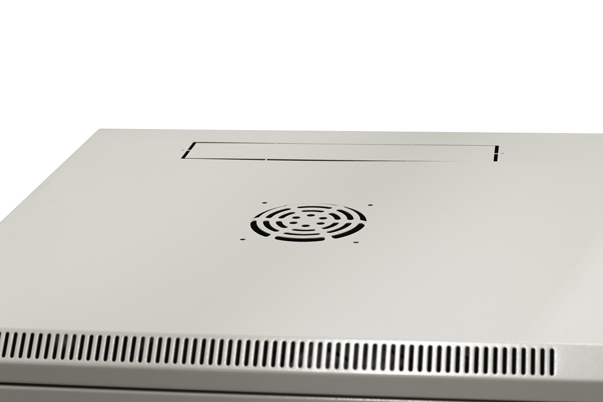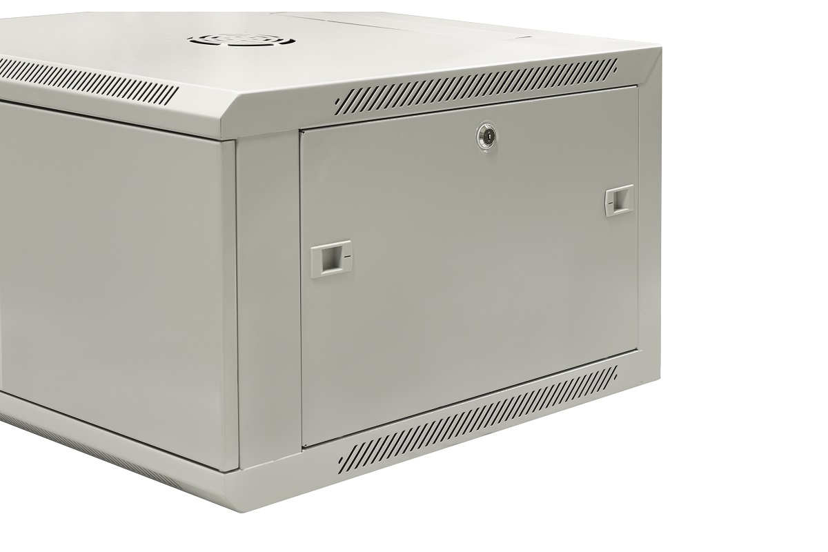 Szafa wisząca niedzielona 19'' 6U, drzwi całe z blachy, ściągane osłony boczne z zamkiem,600×600×370 szer./gł./wys. mm; RAL: szafa 7044, drzwi 7010