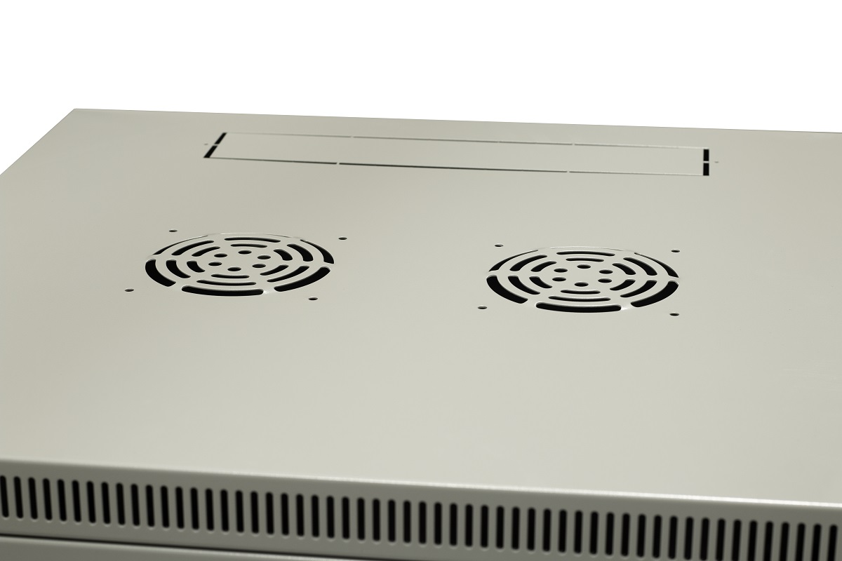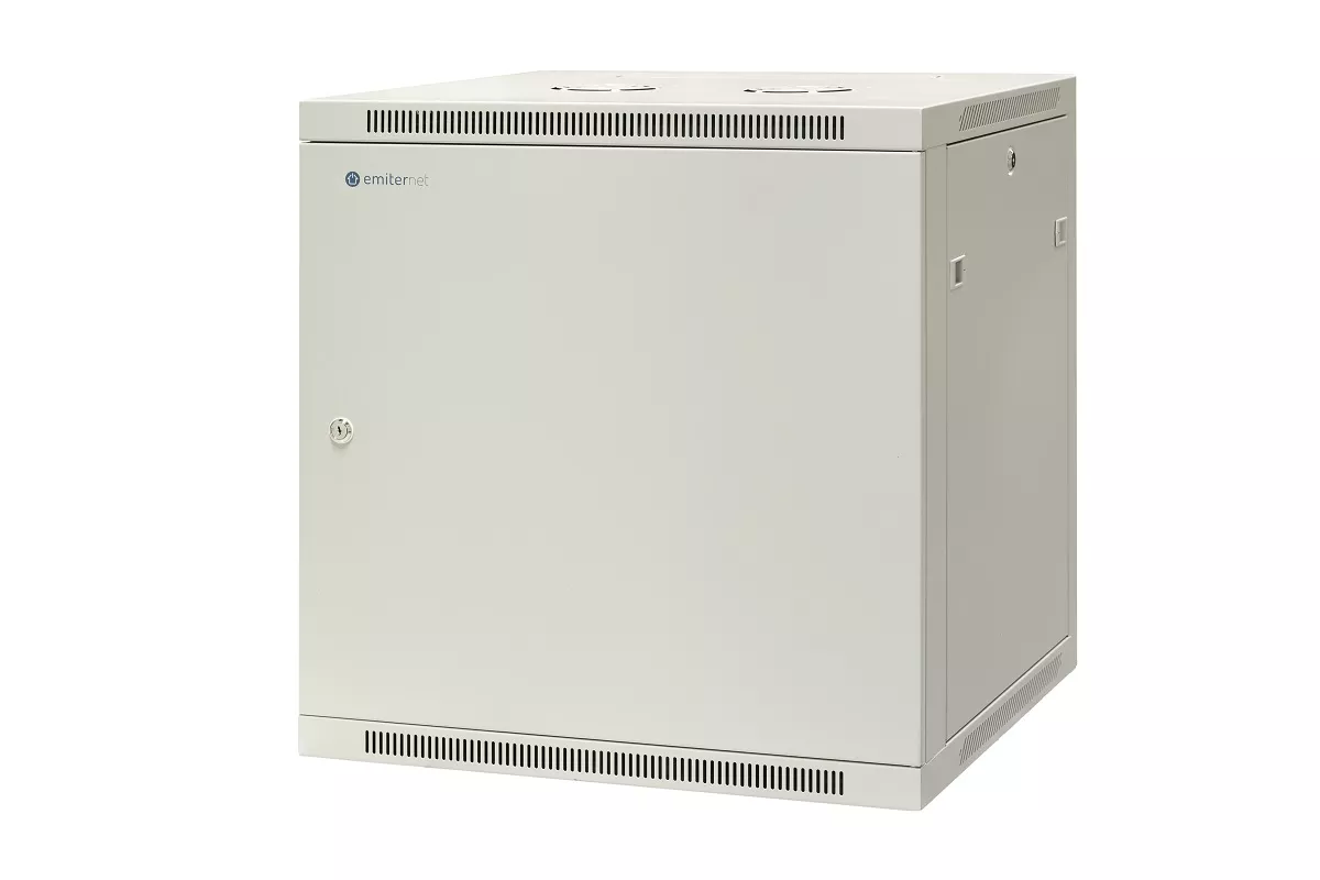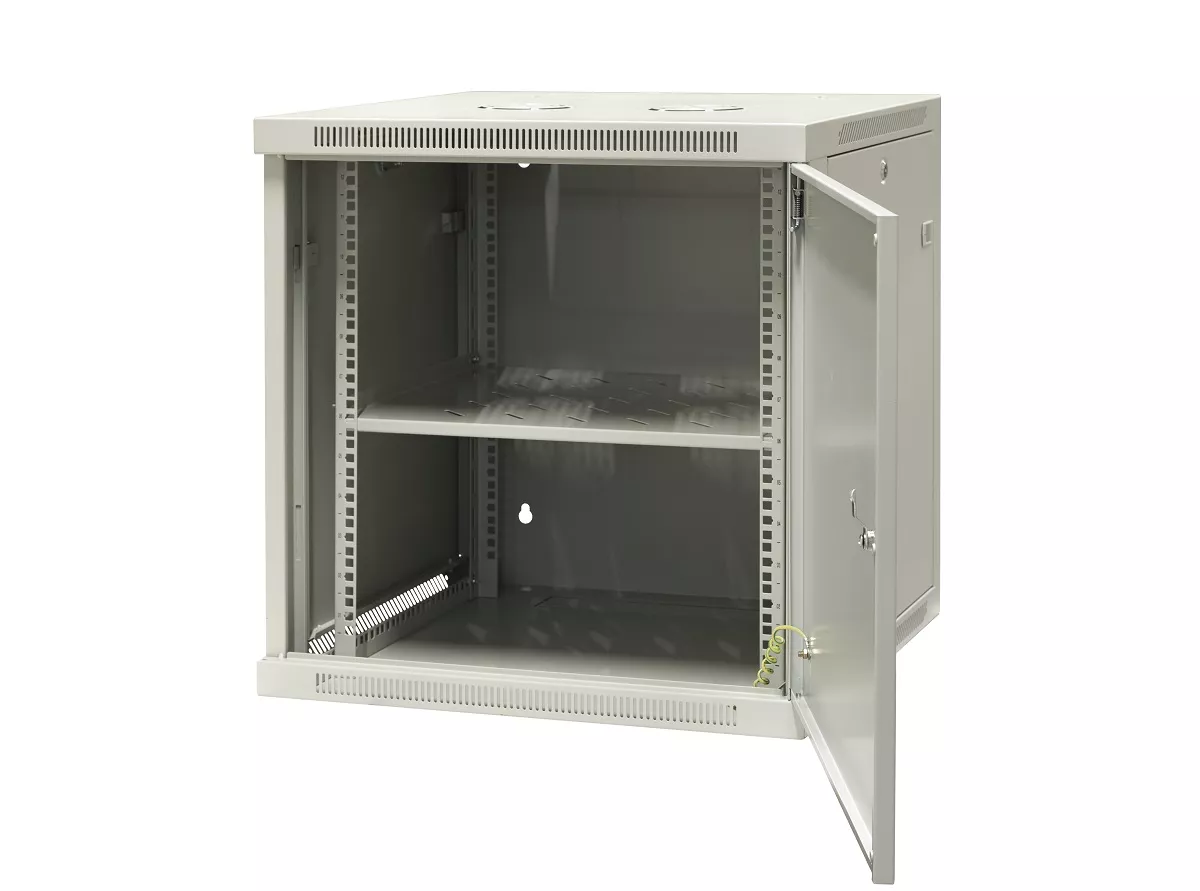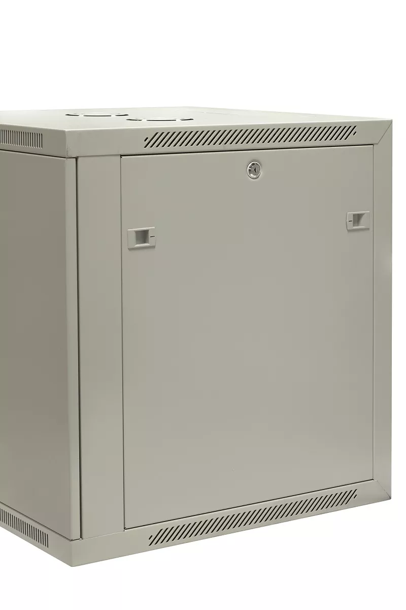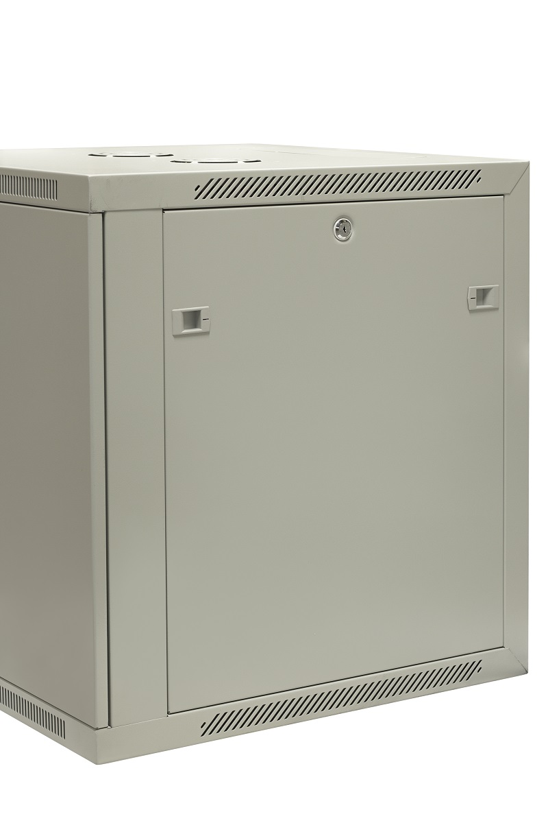 Szafa wisząca niedzielona 19'' 12U, drzwi całe z blachy, ściągane osłony boczne z zamkiem, 600×600×635 szer./gł./wys. mm; RAL: szafa 7044, drzwi 7010