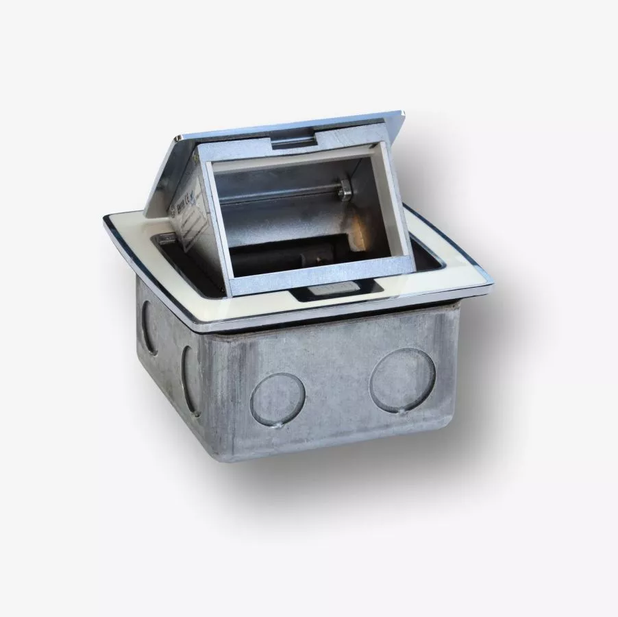 Puszka blatowa z ramką do instalacji osprzętu w standardzie 45x45 (gniazda elektryczne, teletechniczne i in.) . Pojemność puszki 3 moduły 22,5x45 (1 moduł 45x45 + 1 moduł 22,5x45 ). Pokrywa wykończona żywicą w kolorze białym. Wyposażona w kostkę przyłączeniową i komplet przewodów do podłączenia gniazda elektrycznego. Umożliwia przygotowanie estetycznego punktu abonenckiego teletechnicznego wraz z siecią elektryczną. Typ: puszka pop-up. Wyposażona w mechanizm łagodnego otwierania pokrywy (soft), należy do grupy ekskluzywnych produktów, chakteryzujących się wyszukanym wzronictwem. Posiada podwyższony stopień ochrony IP44.